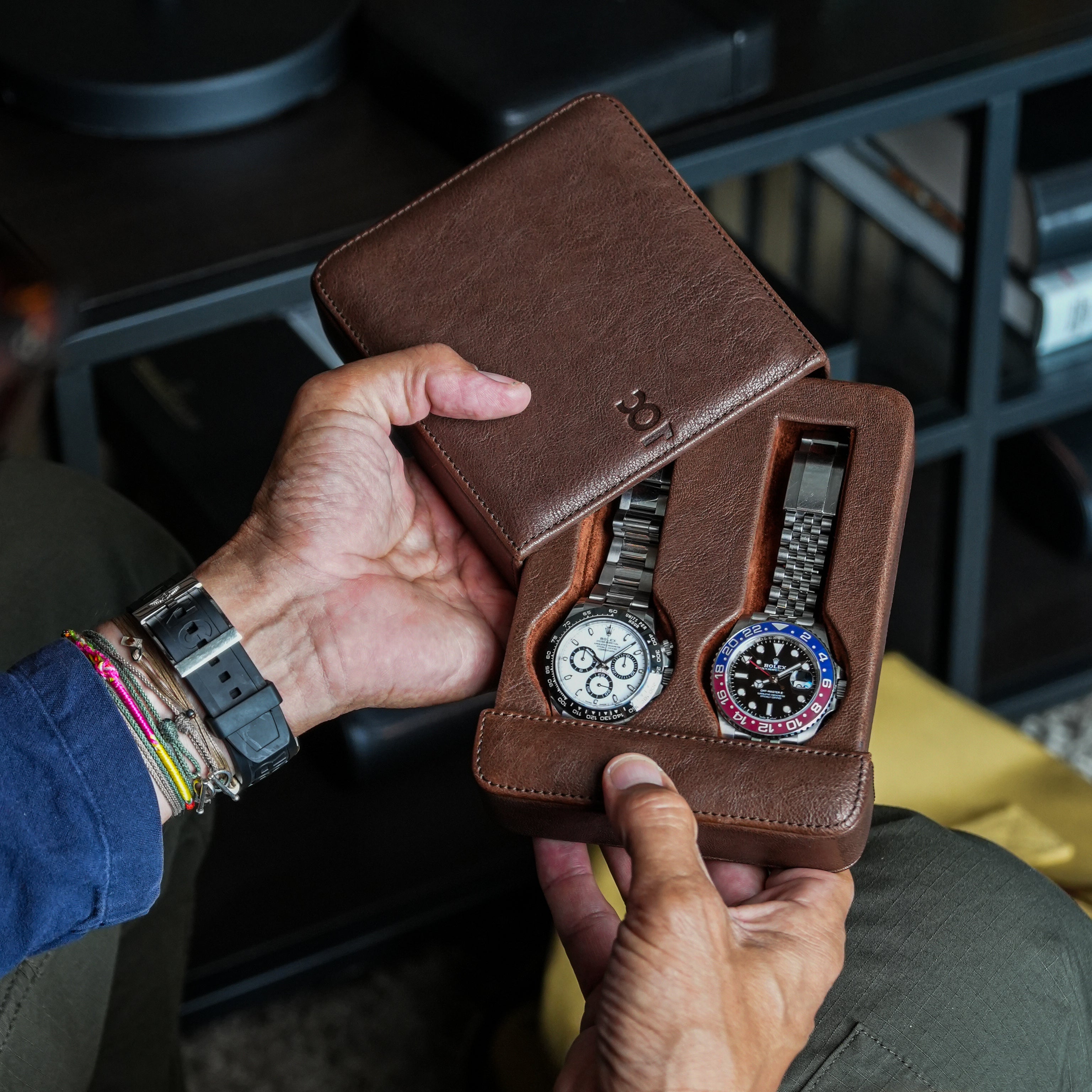 The case holds up to two watches which can be taken out through the smart sliding system. The case is ideal for watches with leather strap, rubber strap etc. But also suitable for watches with bracelet.