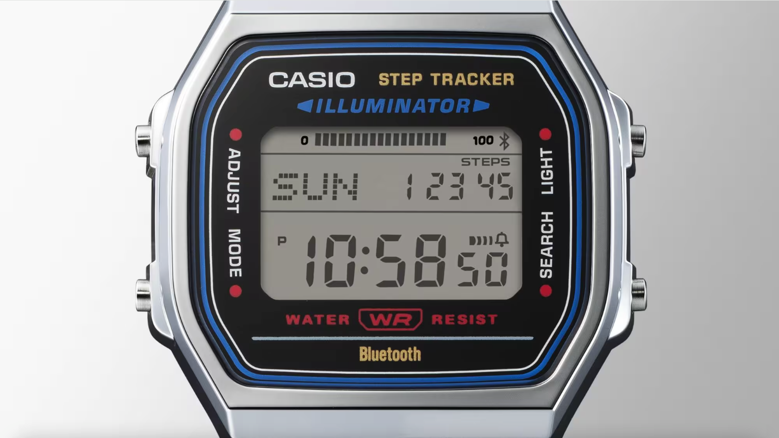 The classic digital icon now integrated with Bluetooth technology and built in step tracker. Beneath its sleek exterior, this watch boasts cutting-edge features tailored to your active lifestyle.