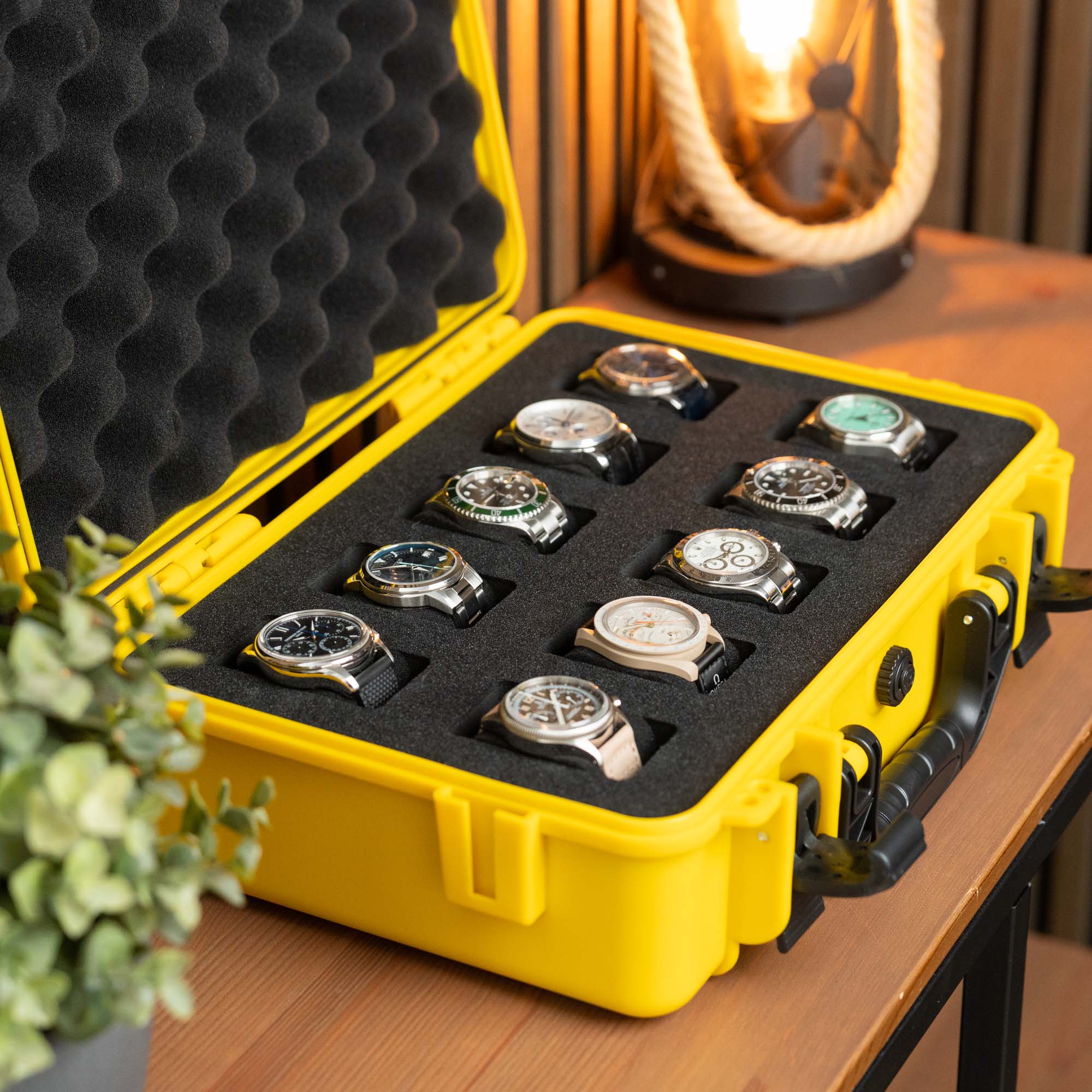 Organize and protect up to 10 watches! This Olive Green watch box is presented in a hard case to give the best possible protection and security for your prized possessions. Perfect for home storage and travel on the go. This watch box is for any watch enthusiast or collector. The interior features high-quality foam, precisely cut to ensure a snug fit for each watch.