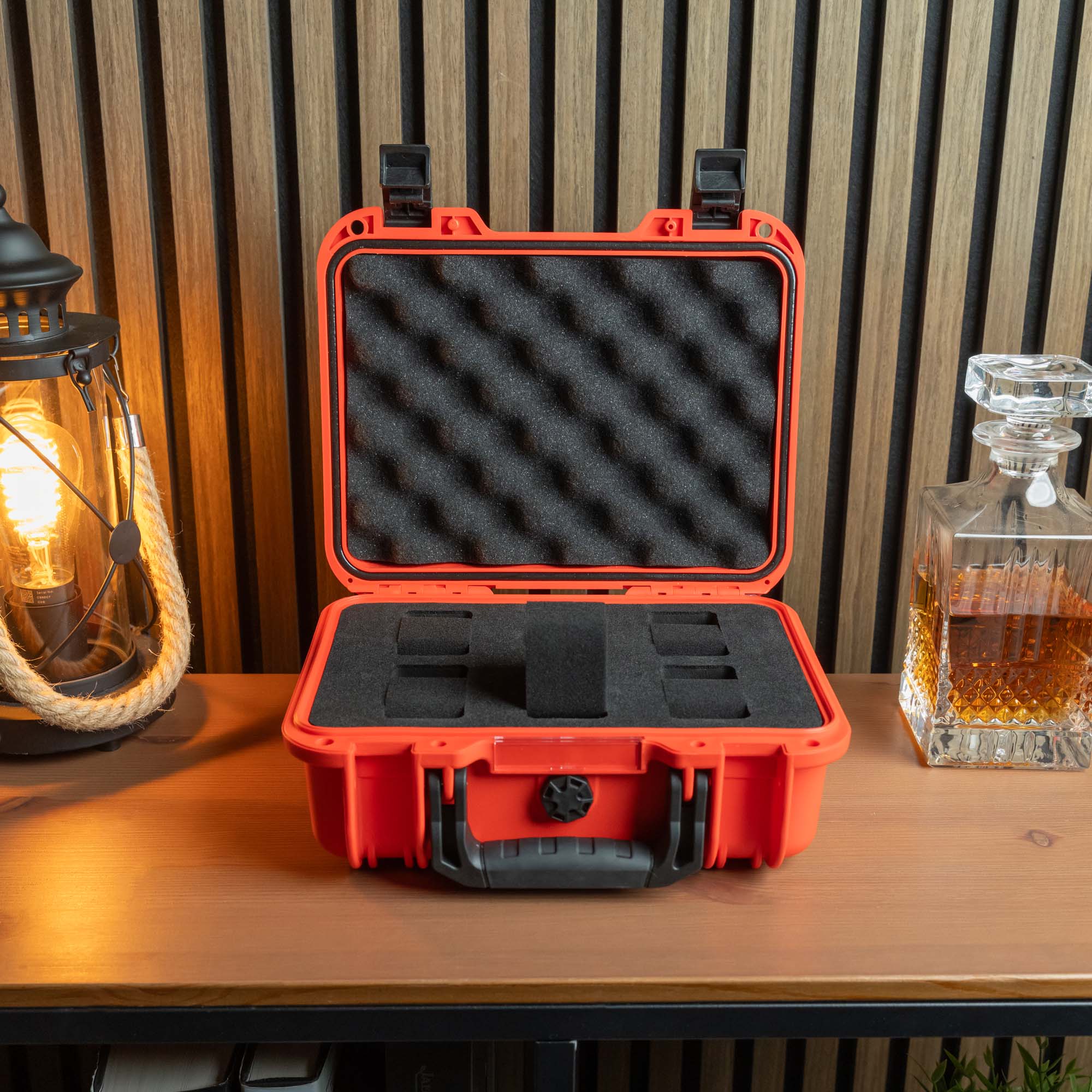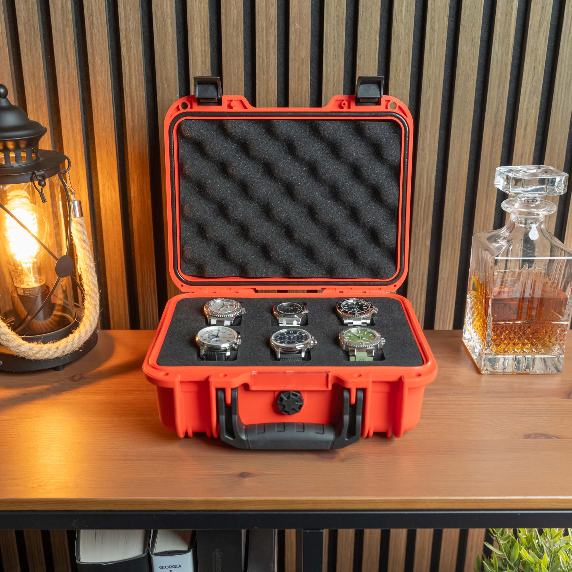 Organize and protect up to 6 watches! This lava red watch box is presented in a hard case to give the best possible protection and security for your prized possessions. Perfect for home storage and travel on the go. This watch box is for any watch enthusiast or collector. The interior features high-quality foam, precisely cut to ensure a snug fit for each watch.