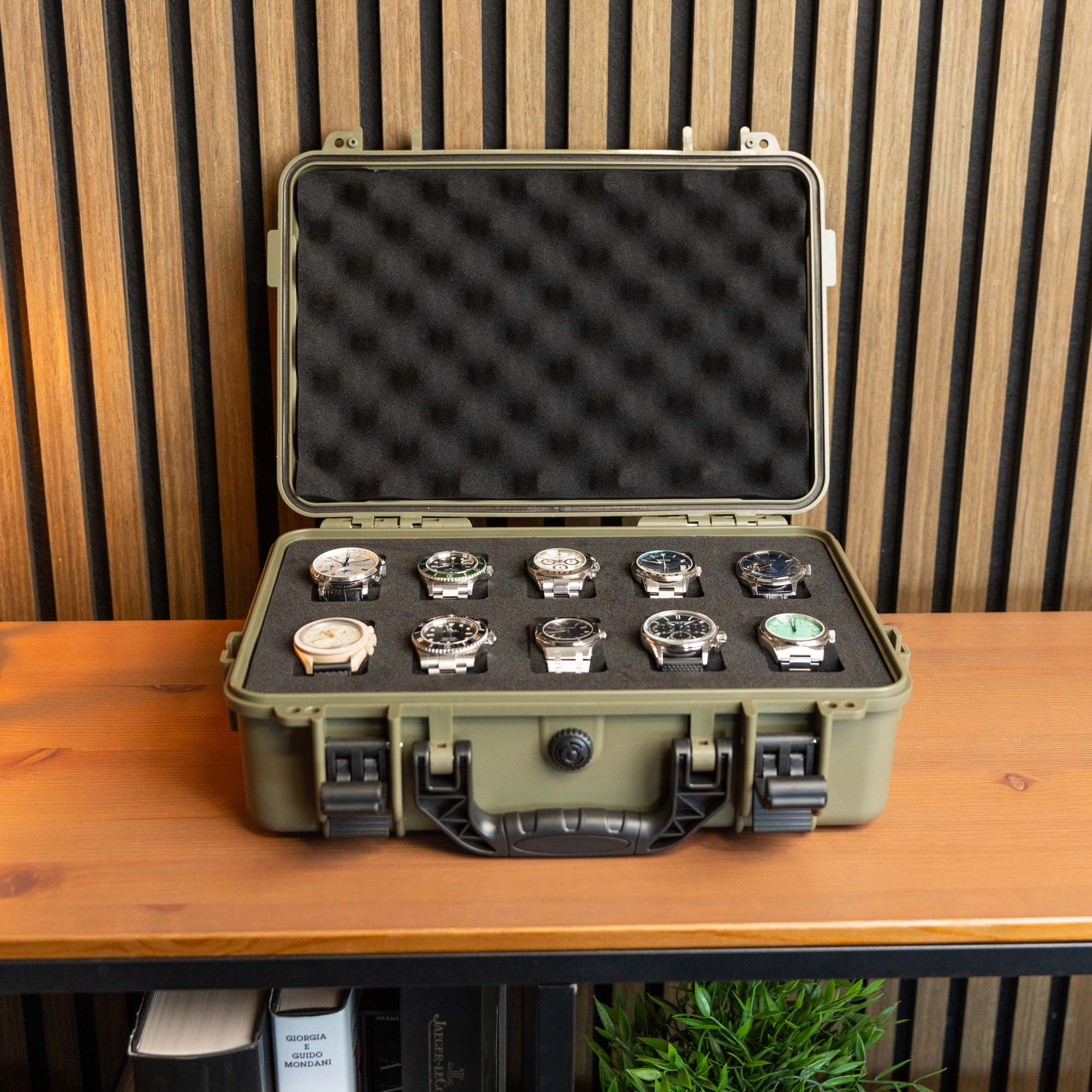 Organize and protect up to 10 watches! This Olive Green watch box is presented in a hard case to give the best possible protection and security for your prized possessions. Perfect for home storage and travel on the go. This watch box is for any watch enthusiast or collector. The interior features high-quality foam, precisely cut to ensure a snug fit for each watch.