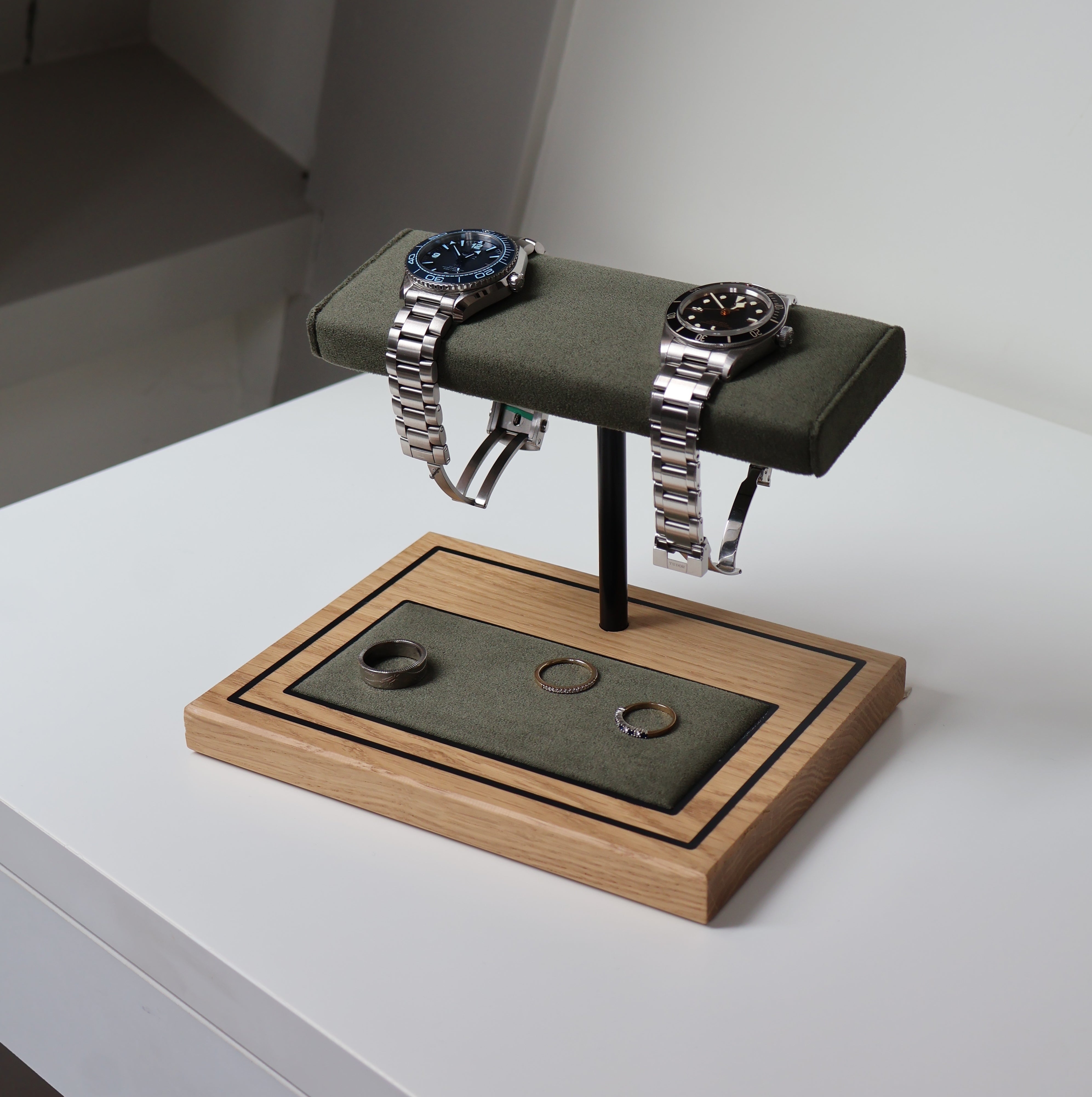 Designed to be sleek and timeless, this is the Foxton watch stand by Realm Design. It offers quick and accessible storage, with the addition of a lower padded area for loose jewelry such as rings, bracelets and cuff links; perfect for the daily wearer.