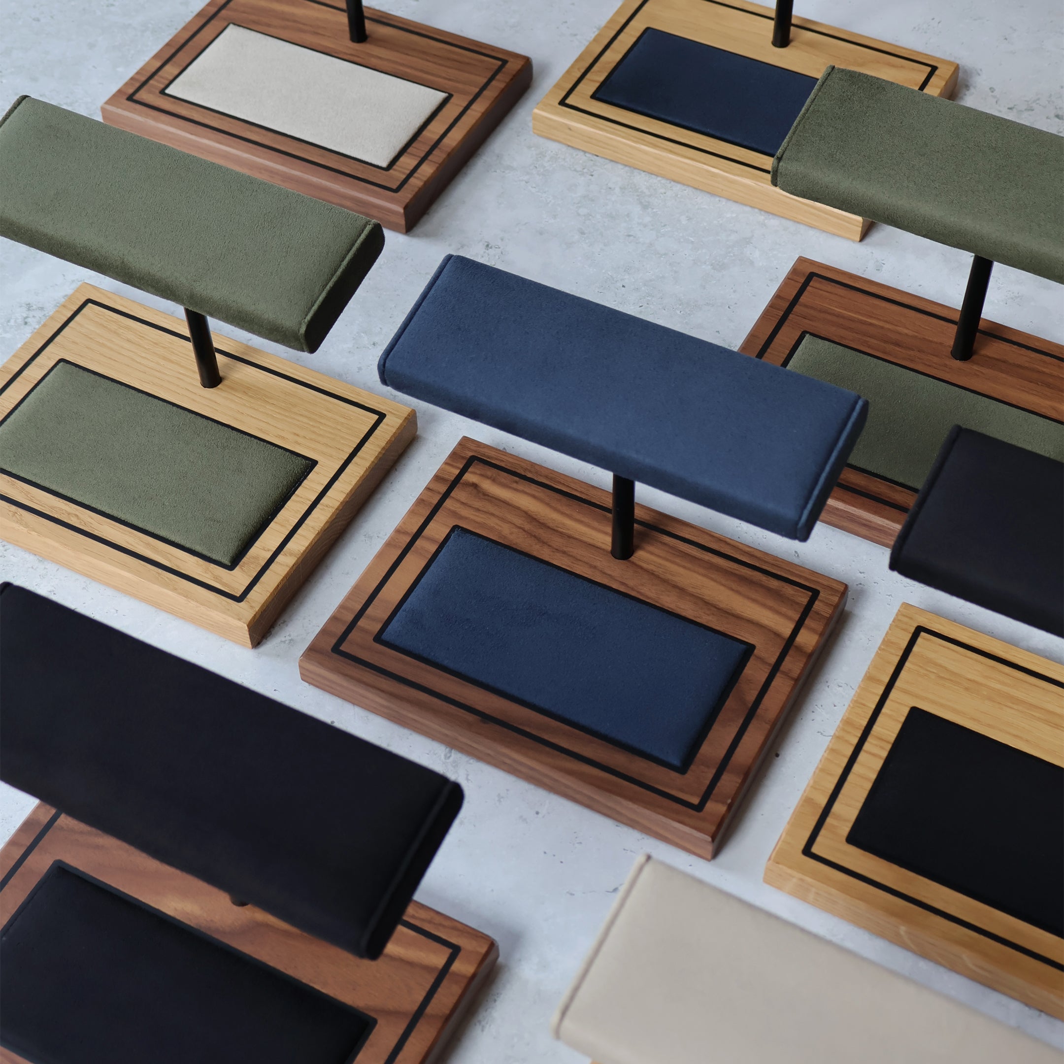 Designed to be sleek and timeless, this is the Foxton watch stand by Realm Design. It offers quick and accessible storage, with the addition of a lower padded area for loose jewelry such as rings, bracelets and cuff links; perfect for the daily wearer.