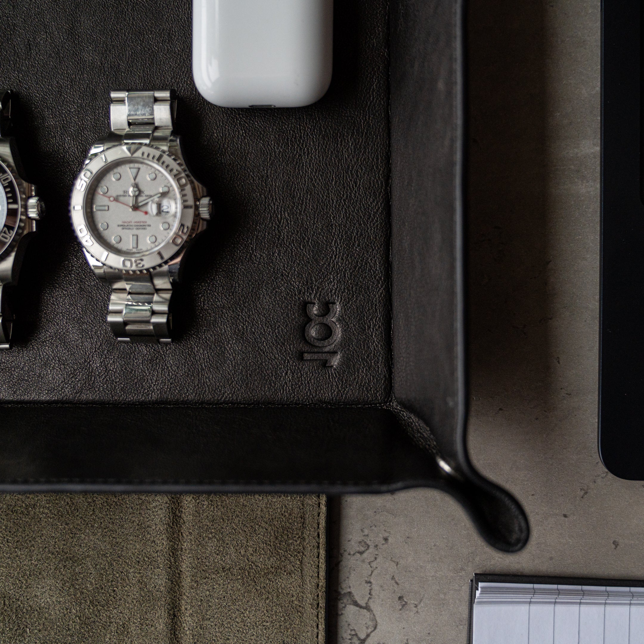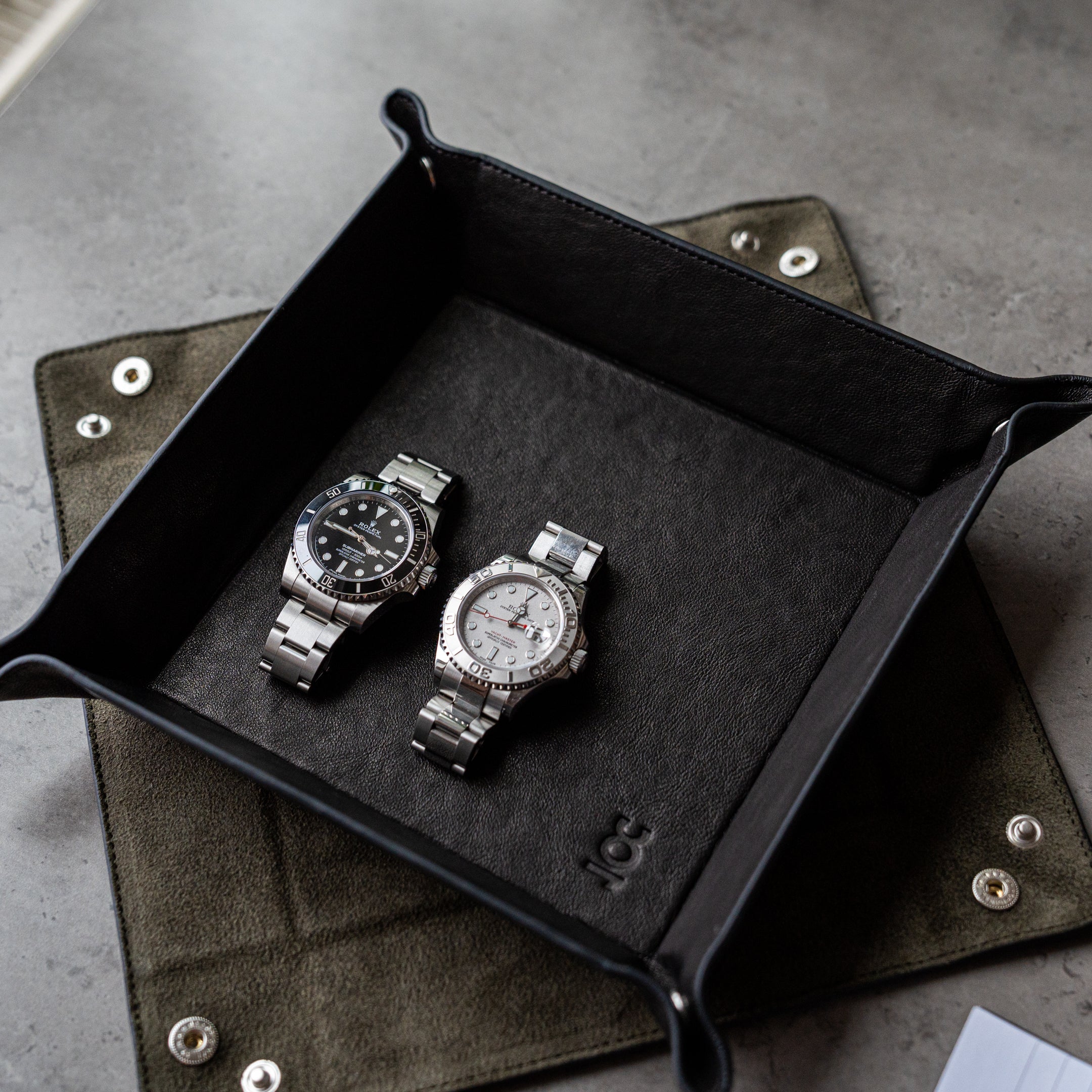 The Black Leather Watch Tray blends refined style with practical convenience to keep your essentials neatly organized. Featuring easy snap buttons for quick assembly, it’s ideal for your bedside, dresser, or office desk, and easy for travels. A stylish display that ensures protection for your favorite items.