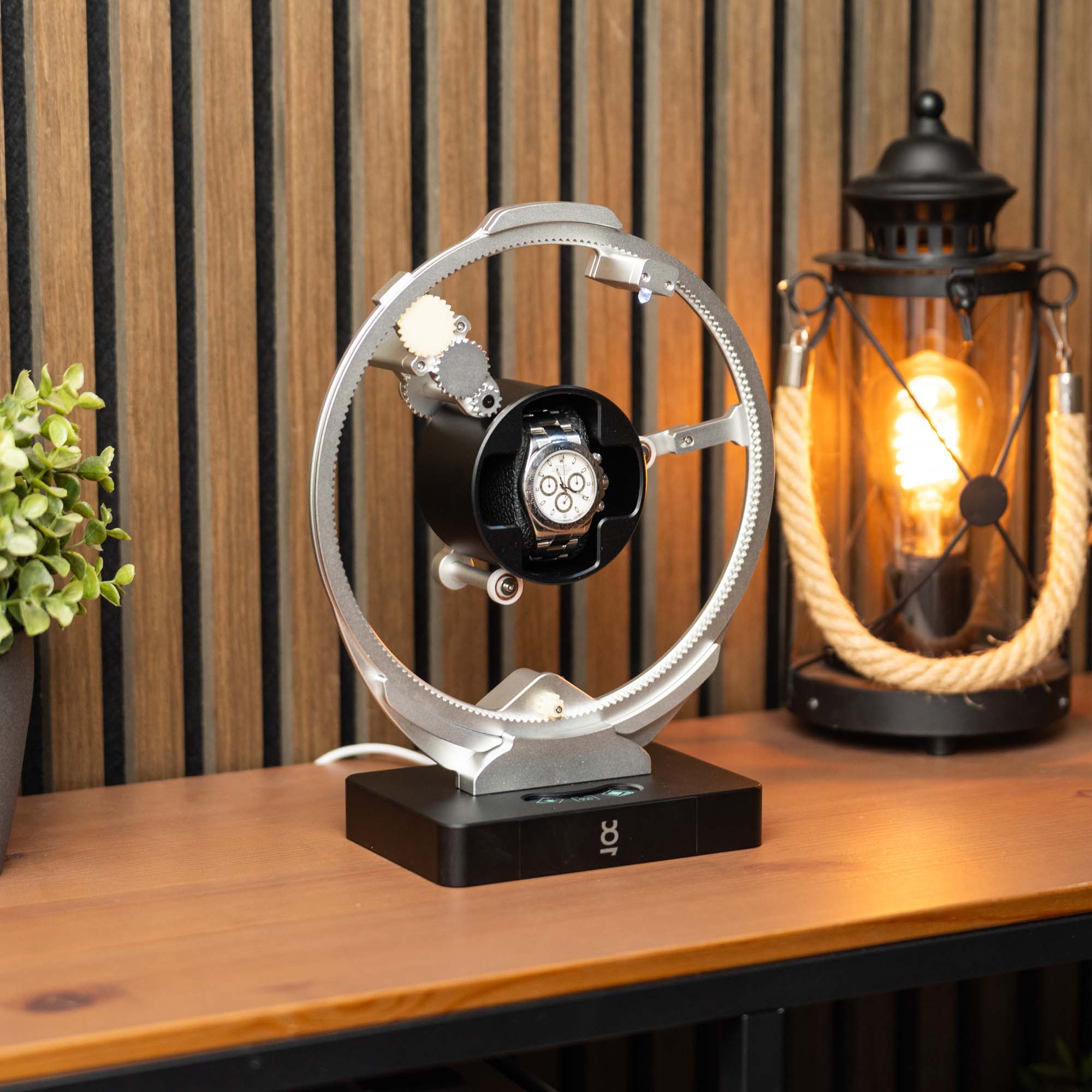 Every rotation mimics the rhythm of time itself, offering a captivating display while keeping your automatic watch perfectly wound. It's finely engineered teeth and skeletonized design highlight the artistry of watchmaking, making it the perfect centerpiece for any collection.