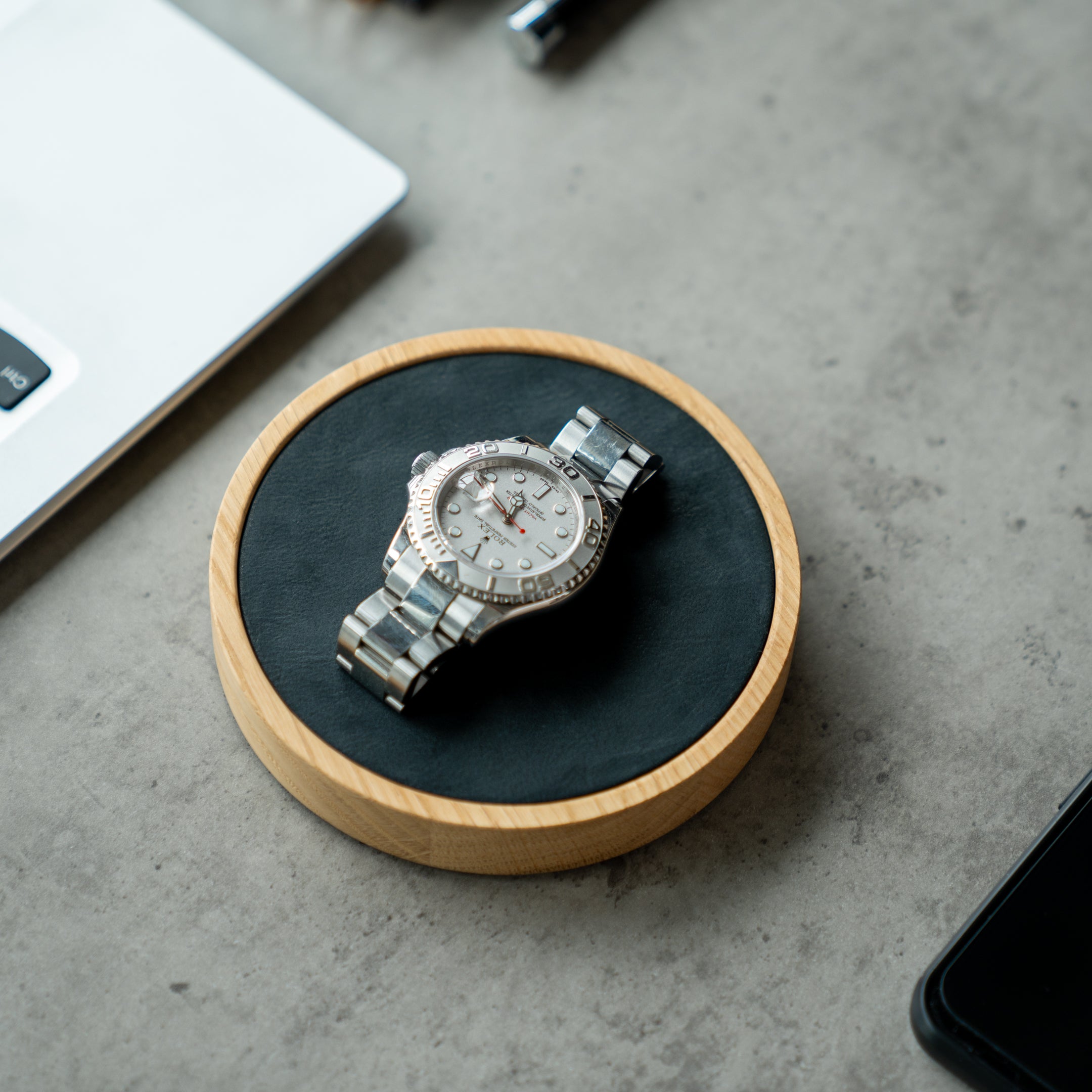 This watch mats is using FSC® certified oak wood, coated with the best hardwax-oil. Milled in the bottom is a non-slip ring and a brass emblem of authenticity in the center.