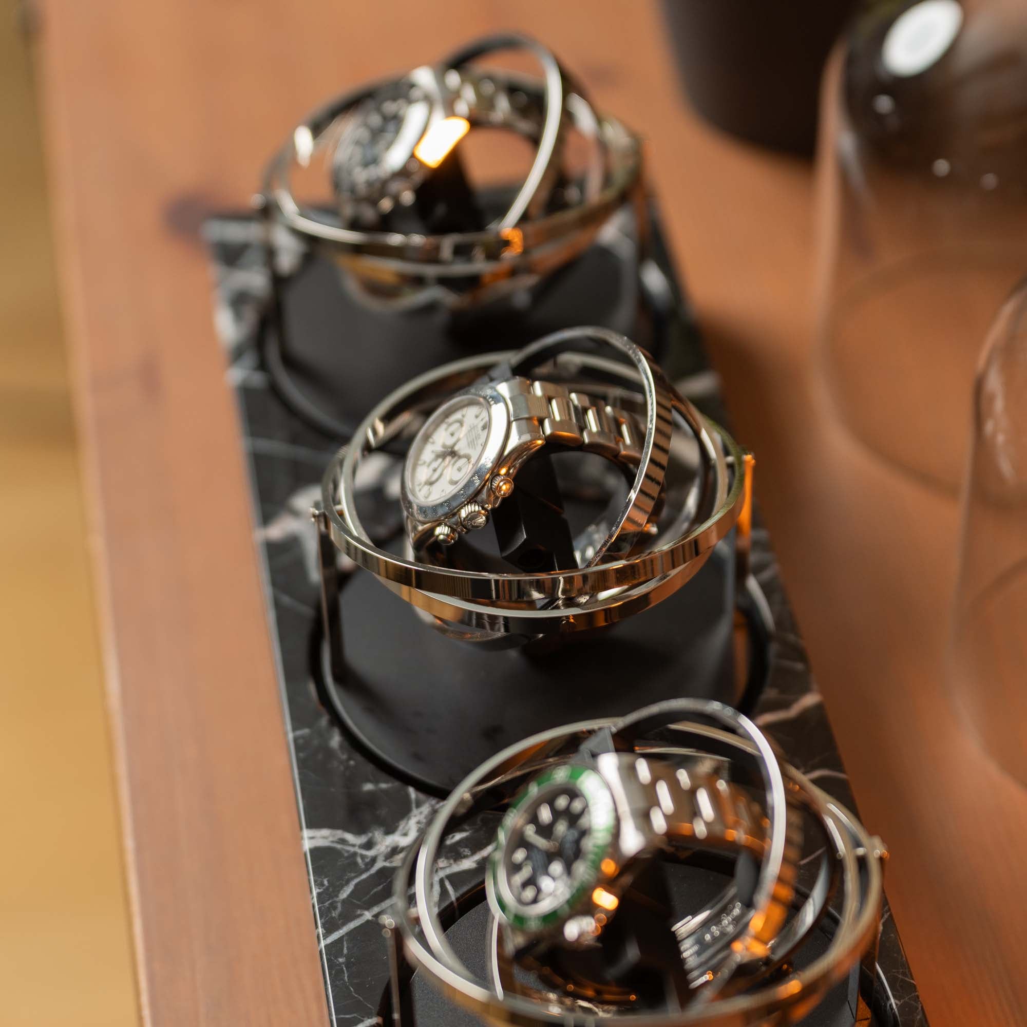 This striking trio watch winder combines gyroscopic inspired motion with a solid marble base, making sure your mechanical watch is ready and functional at all times.