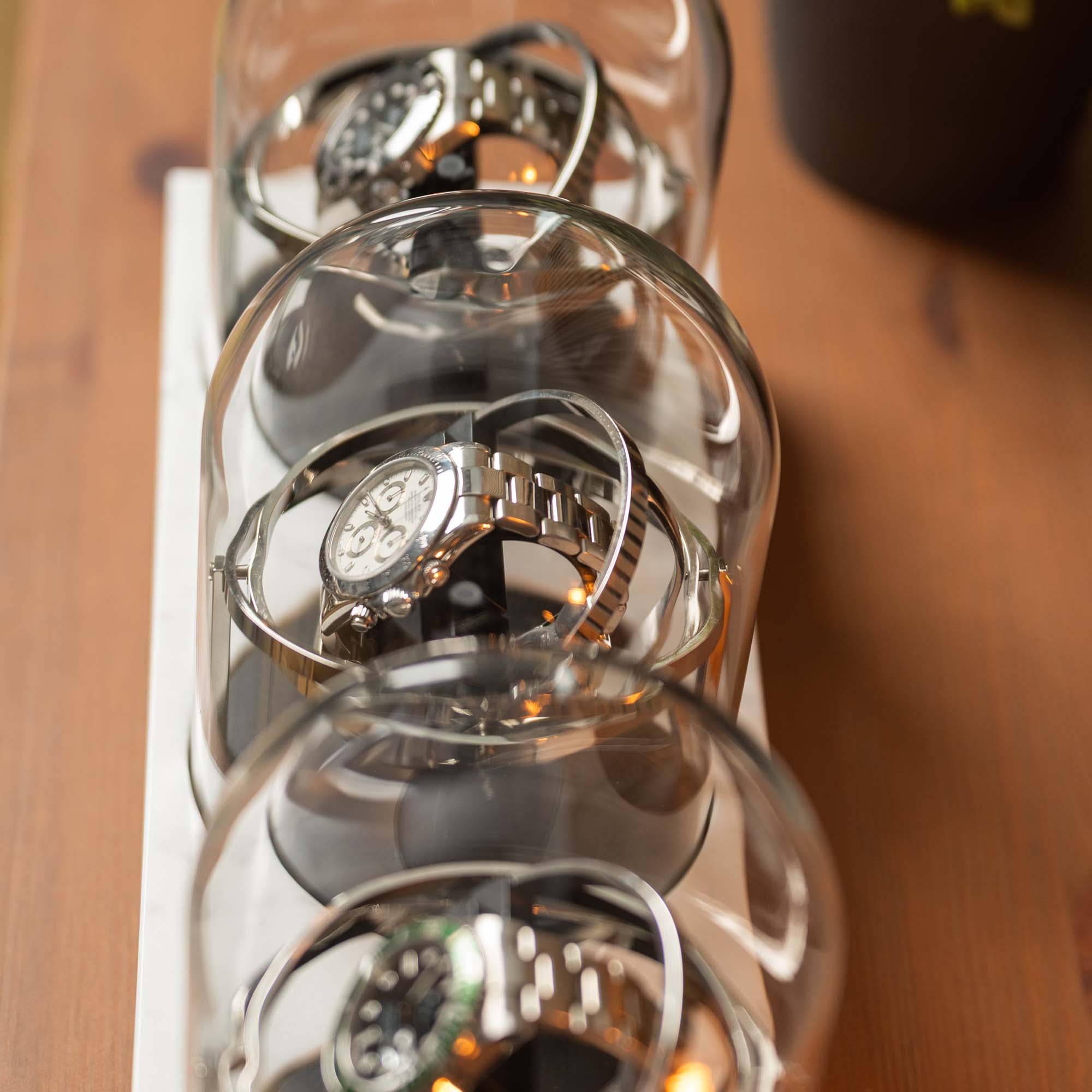 This striking trio watch winder combines gyroscopic inspired motion with a solid marble base, making sure your mechanical watch is ready and functional at all times.