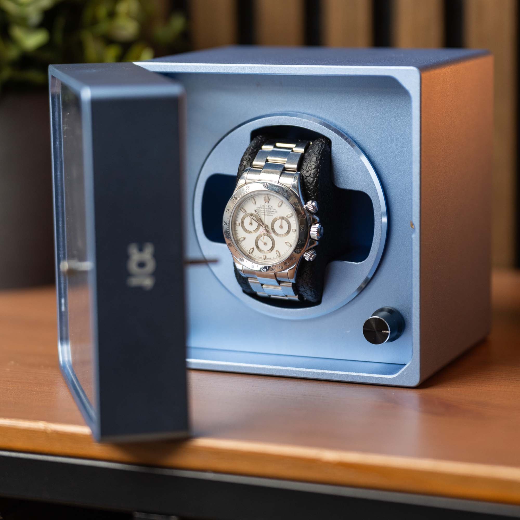 Housed in a geometric frame that exudes quiet luxury, the winder blends seamlessly into any interior—whether displayed on your desk, dresser, or in a vault. Inside, a whisper-quiet motor rotates with precision, maintaining your watch’s power reserve and mechanical integrity.