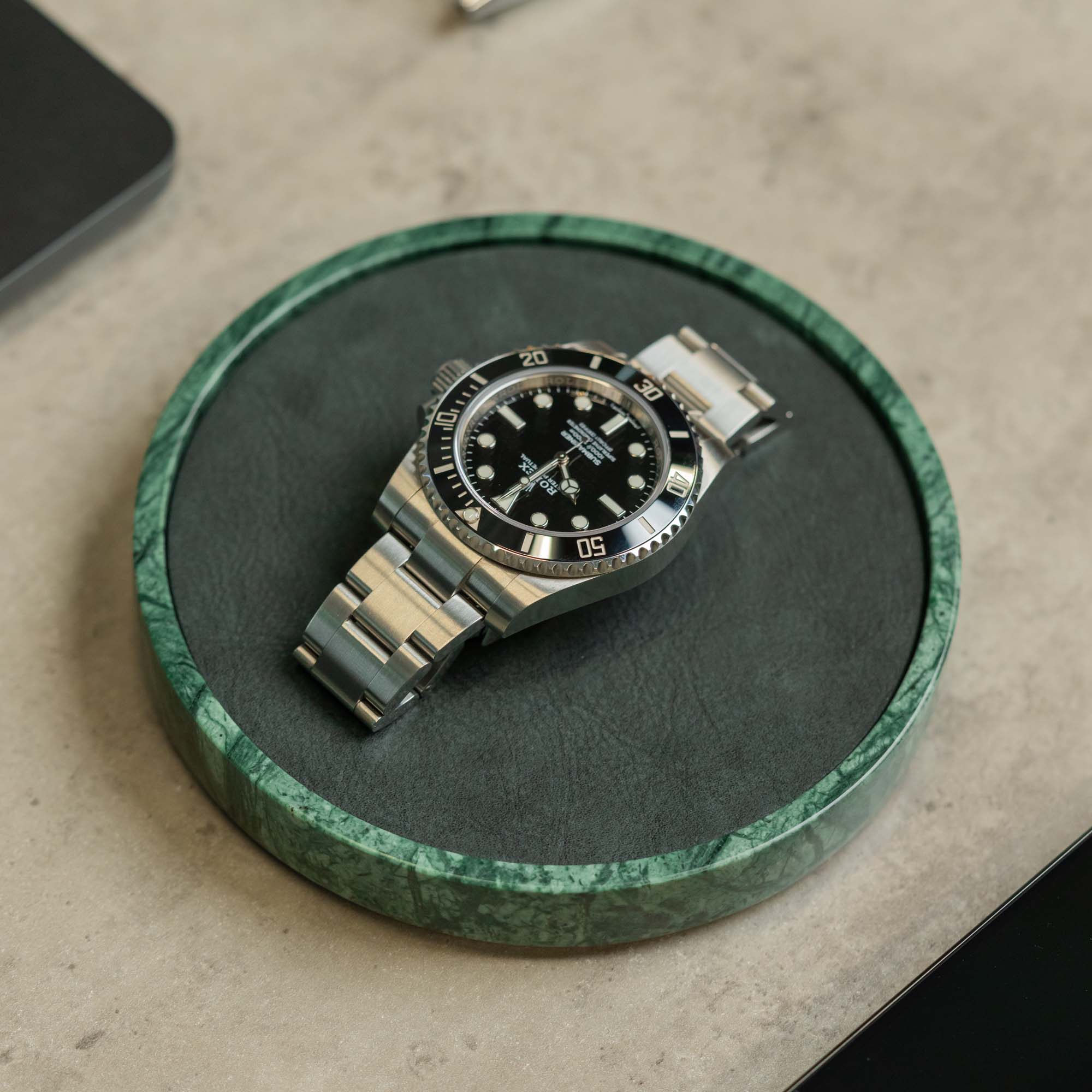 This watchmat is milled from a solid block of marble. Carved in the bottom is a non-slip ring and a brass emblem of authenticity in the center.