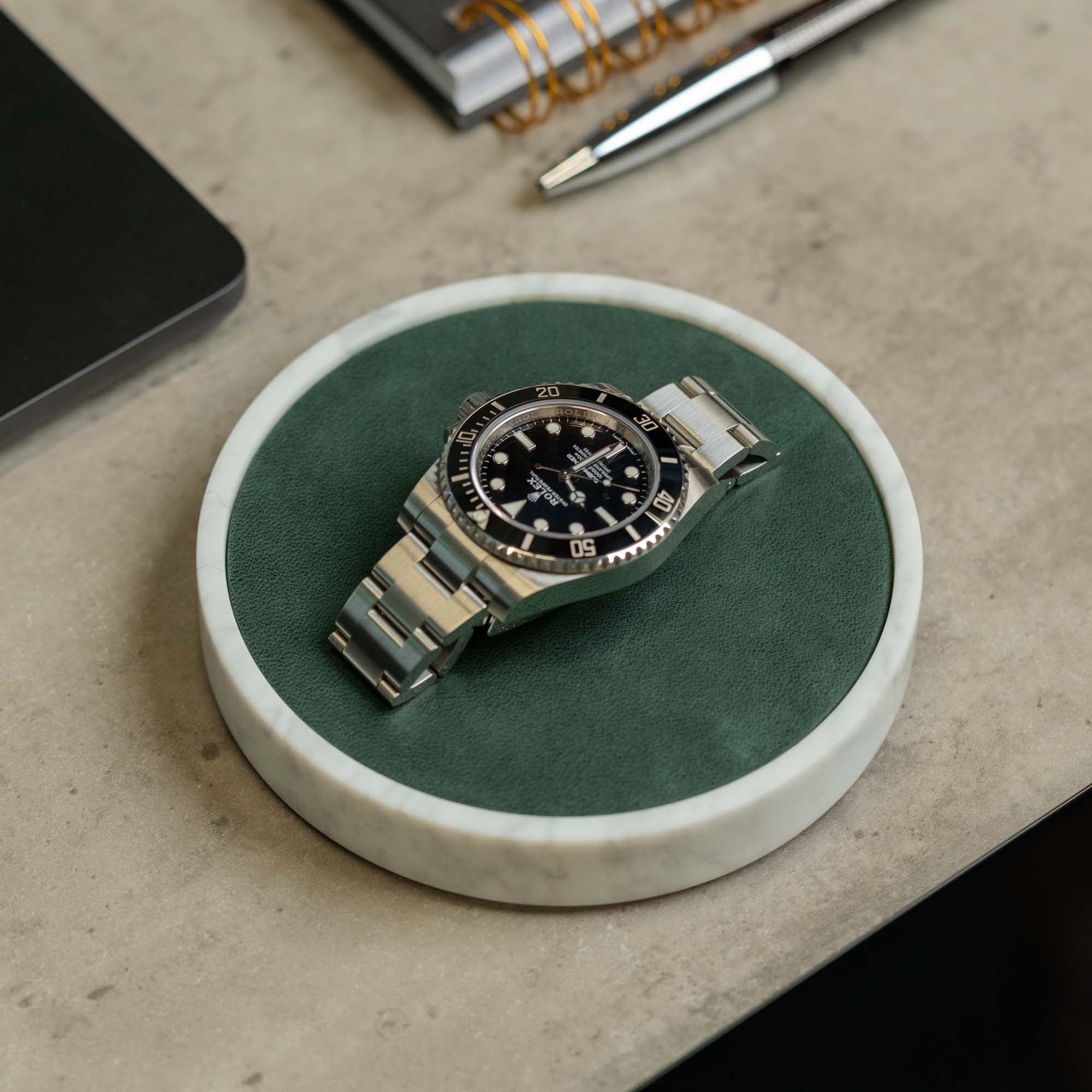 This watchmat is milled from a solid block of marble. Carved in the bottom is a non-slip ring and a brass emblem of authenticity in the center.