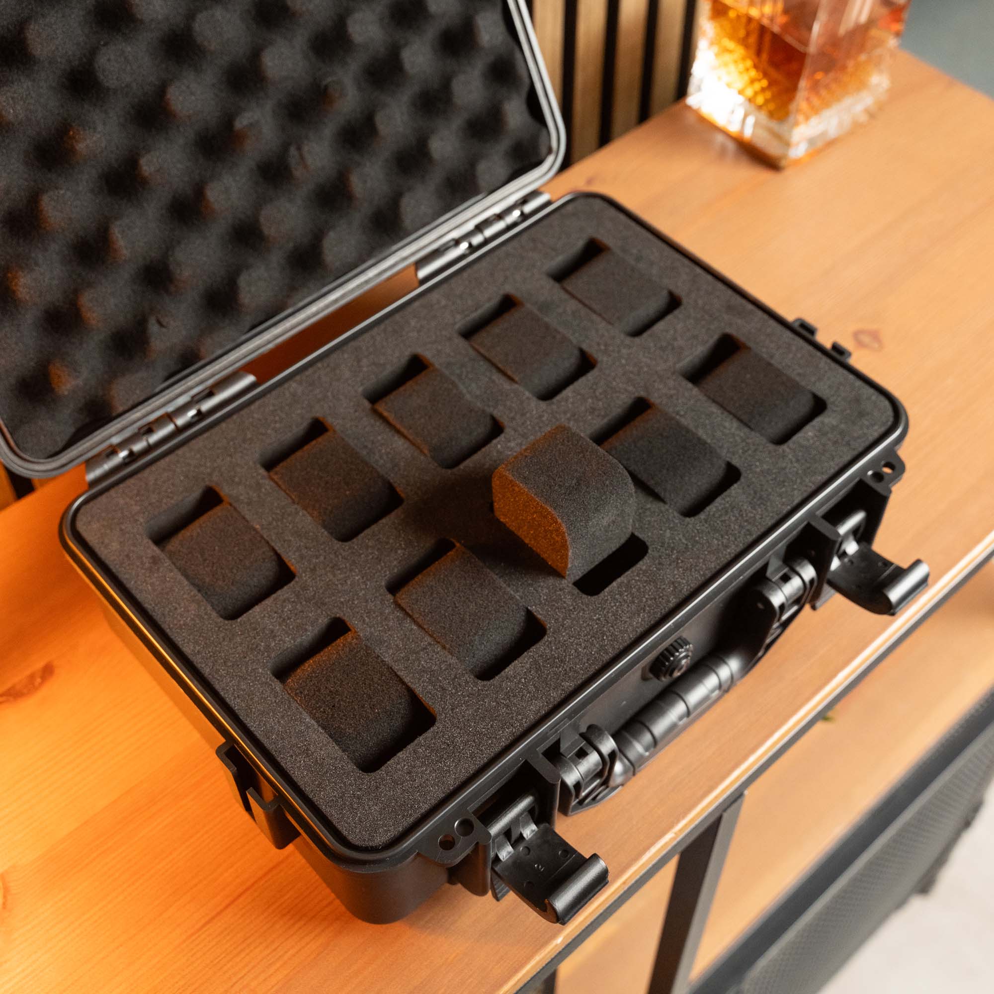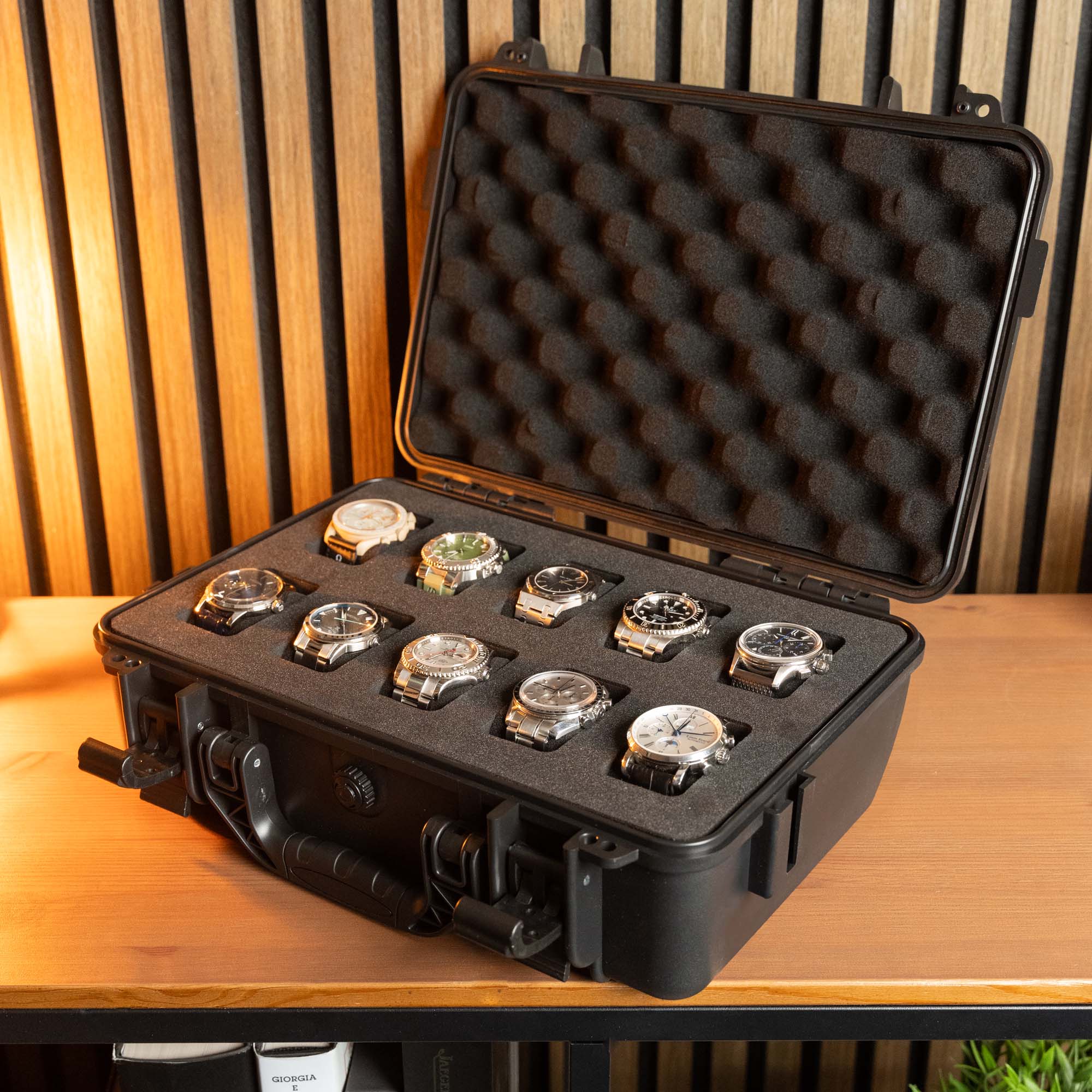 Organize and protect up to 10 watches! This all black watch box is presented in a hard case to give the best possible protection and security for your prized possessions. Perfect for home storage and travel on the go. This watch box is for any watch enthusiast or collector. The interior features high-quality foam, precisely cut to ensure a snug fit for each watch.