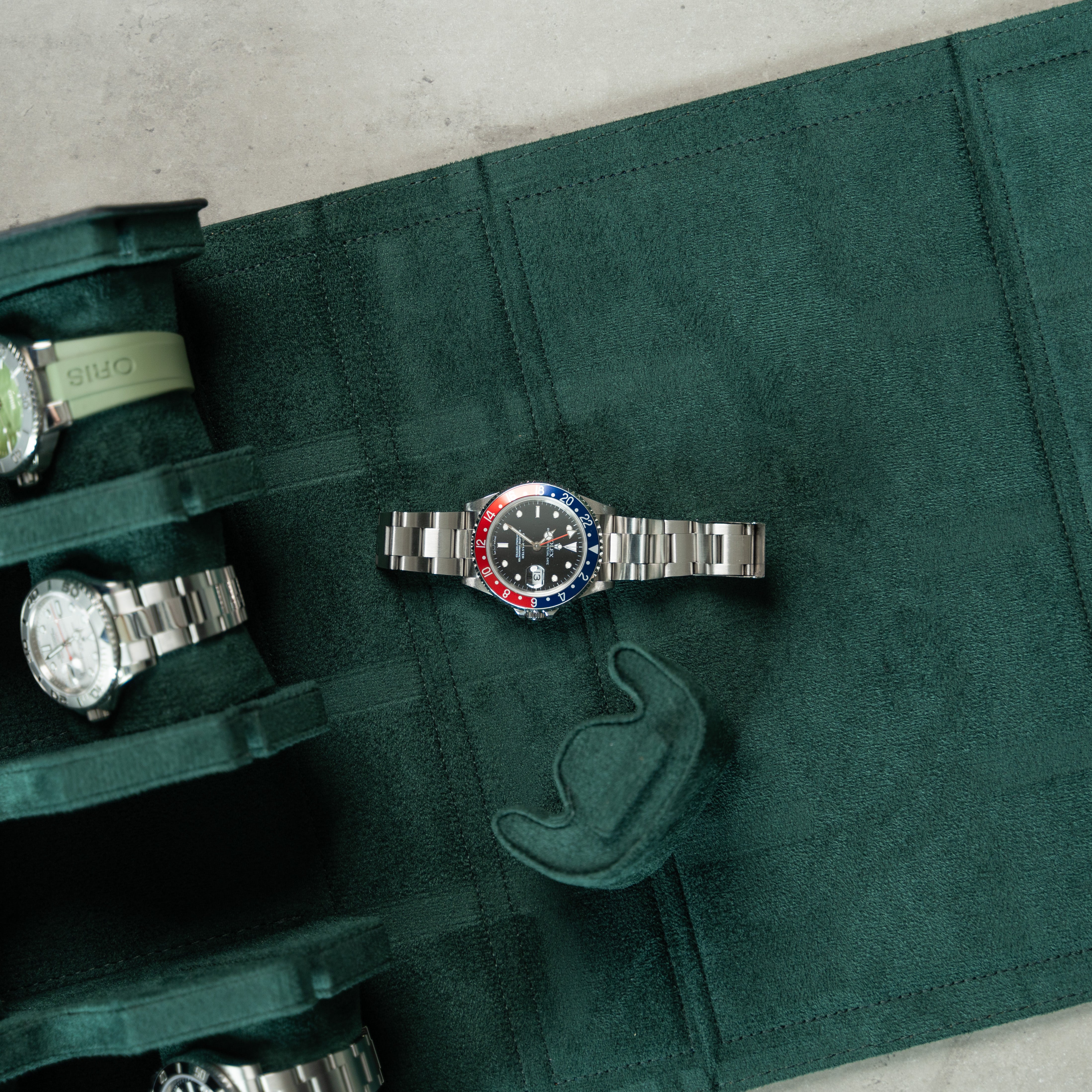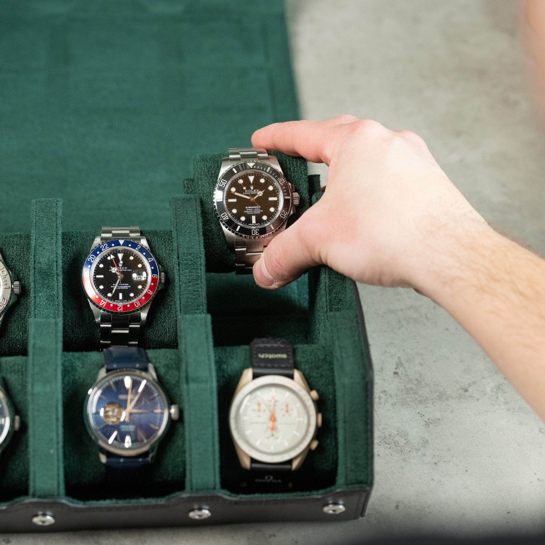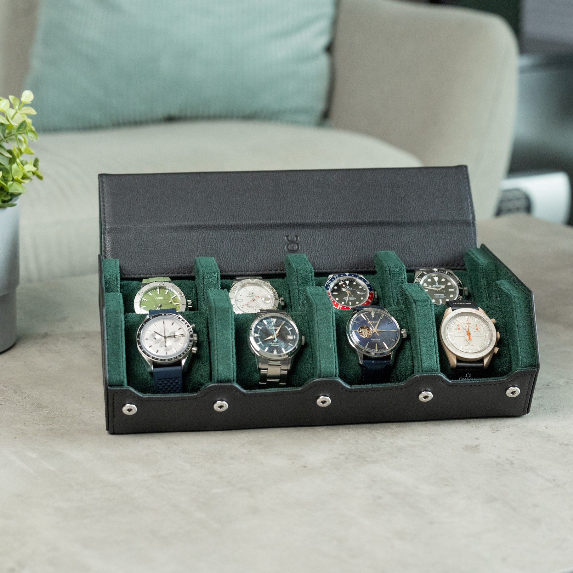 A perfect mix between a watch roll and a watch box. Introducing our watch box for 8 watches with removable cushions for each individual watch using a sliding system. It's specifically designed for watch enthusiasts and watch collectors to protect their prized possessions - whether it is for traveling or to store it at home. The Watch Box is handmade of fine black genuine leather and holds up to eight watches.