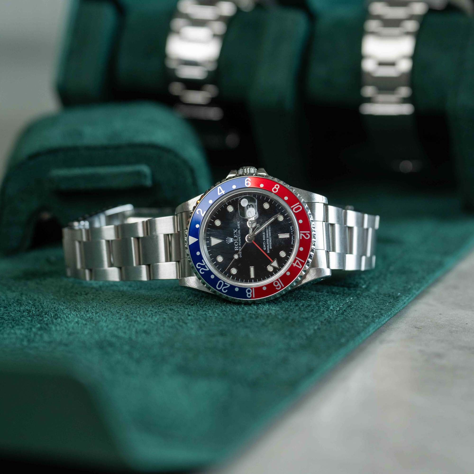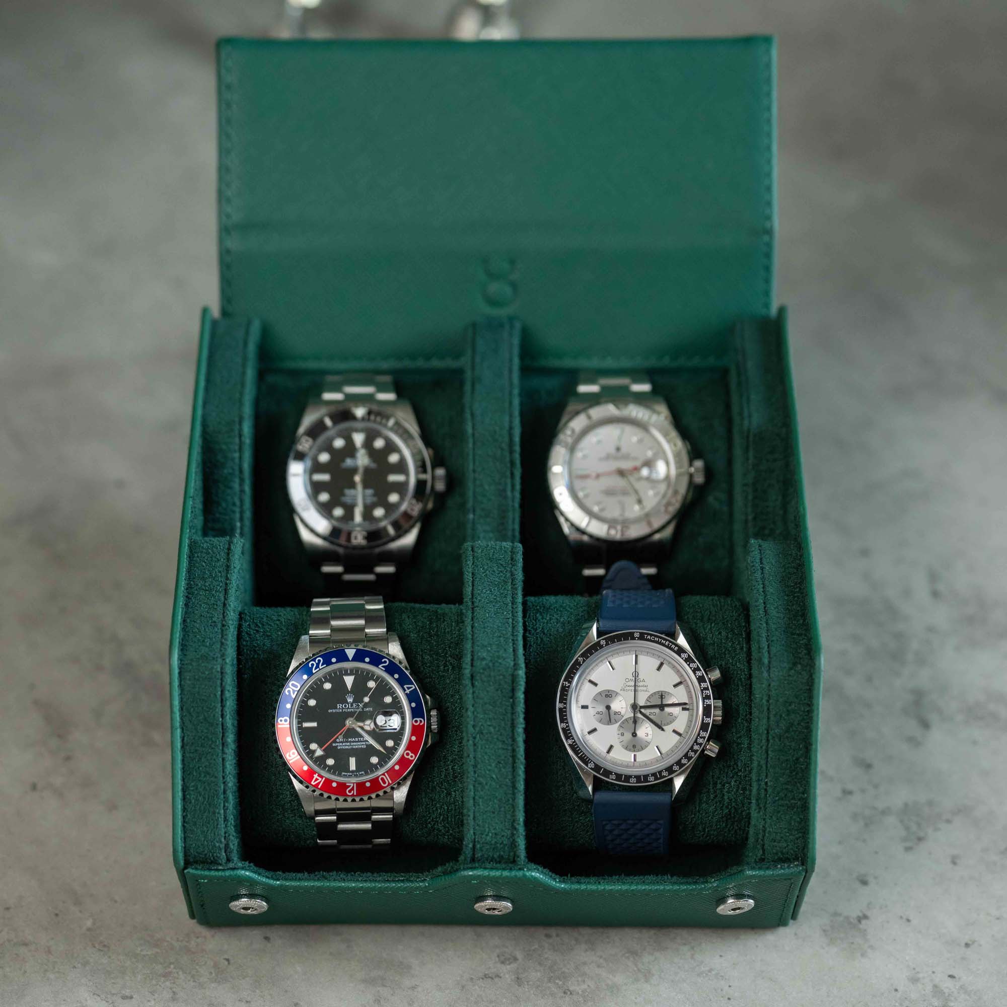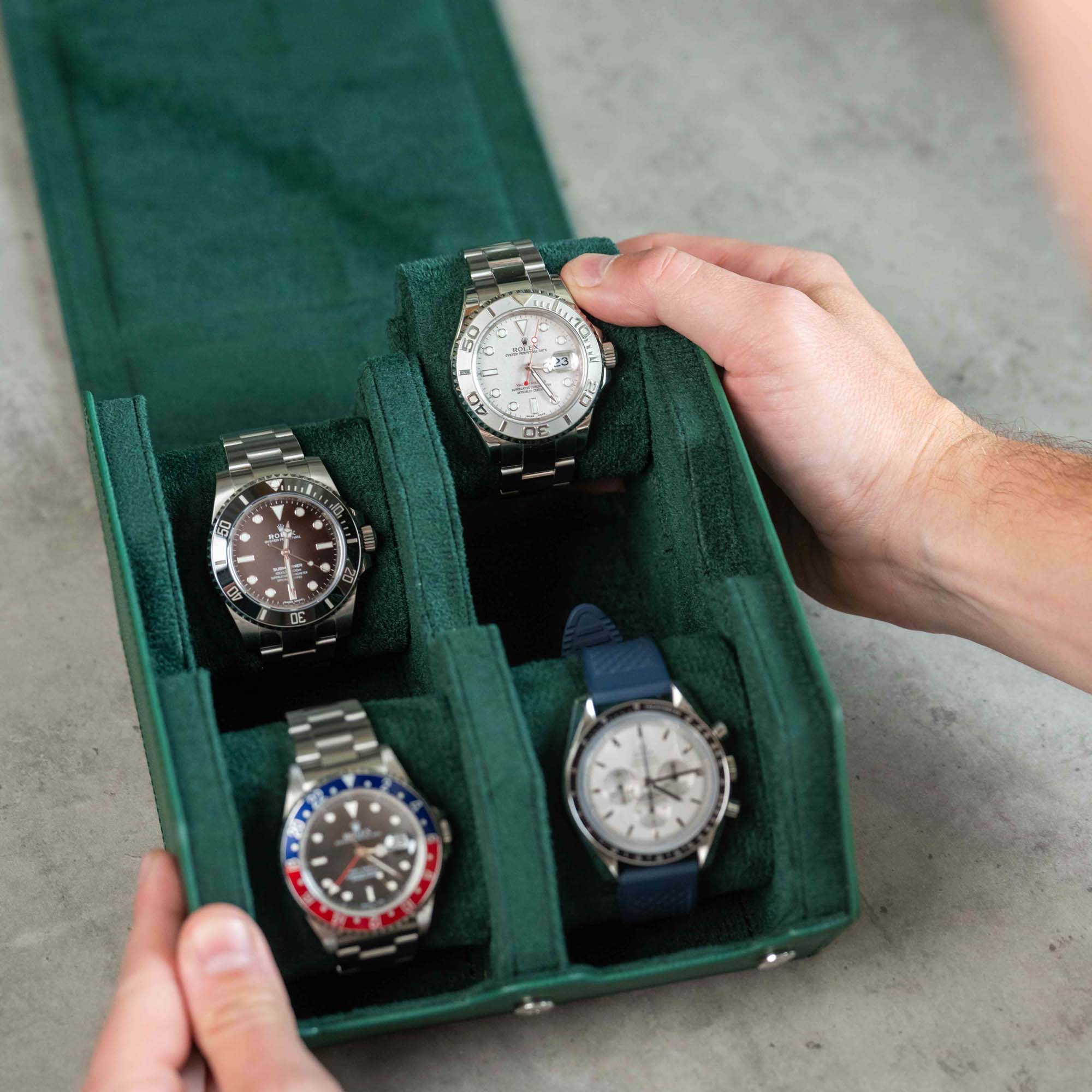 A perfect mix between a watch roll and a watch box. Introducing our watch box for 4 watches with removable cushions for each individual watch using a sliding system. It's specifically designed for watch enthusiasts and watch collectors to protect their prized possessions - whether it is for traveling or to store it at home. The Watch Box is handmade of fine genuine "Rolex green" leather and holds up to four watches.