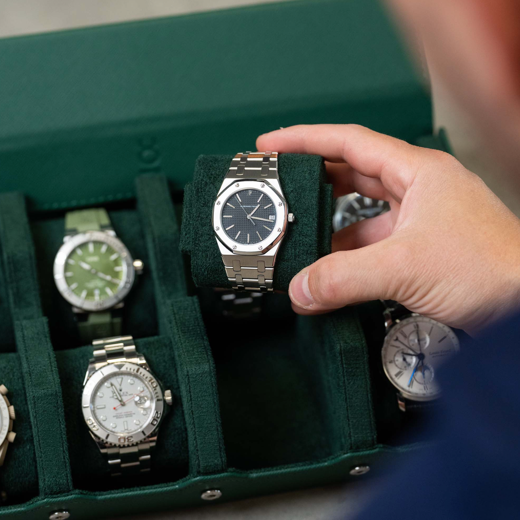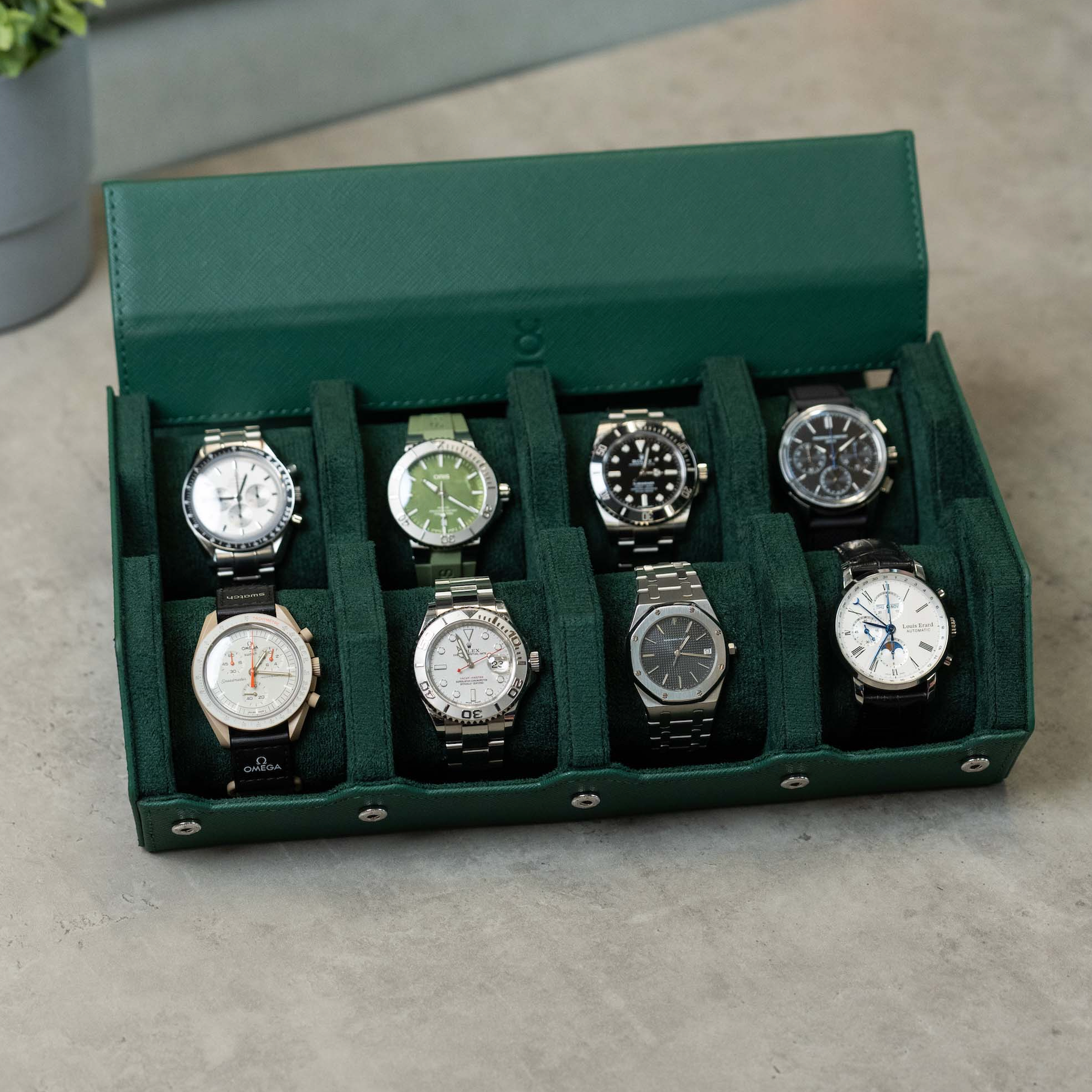 A perfect mix between a watch roll and a watch box. Introducing our watch box for 8 watches with removable cushions for each individual watch using a sliding system. It's specifically designed for watch enthusiasts and watch collectors to protect their prized possessions - whether it is for traveling or to store it at home. The Watch Box is handmade of fine green saffiano genuine leather and holds up to eight watches.