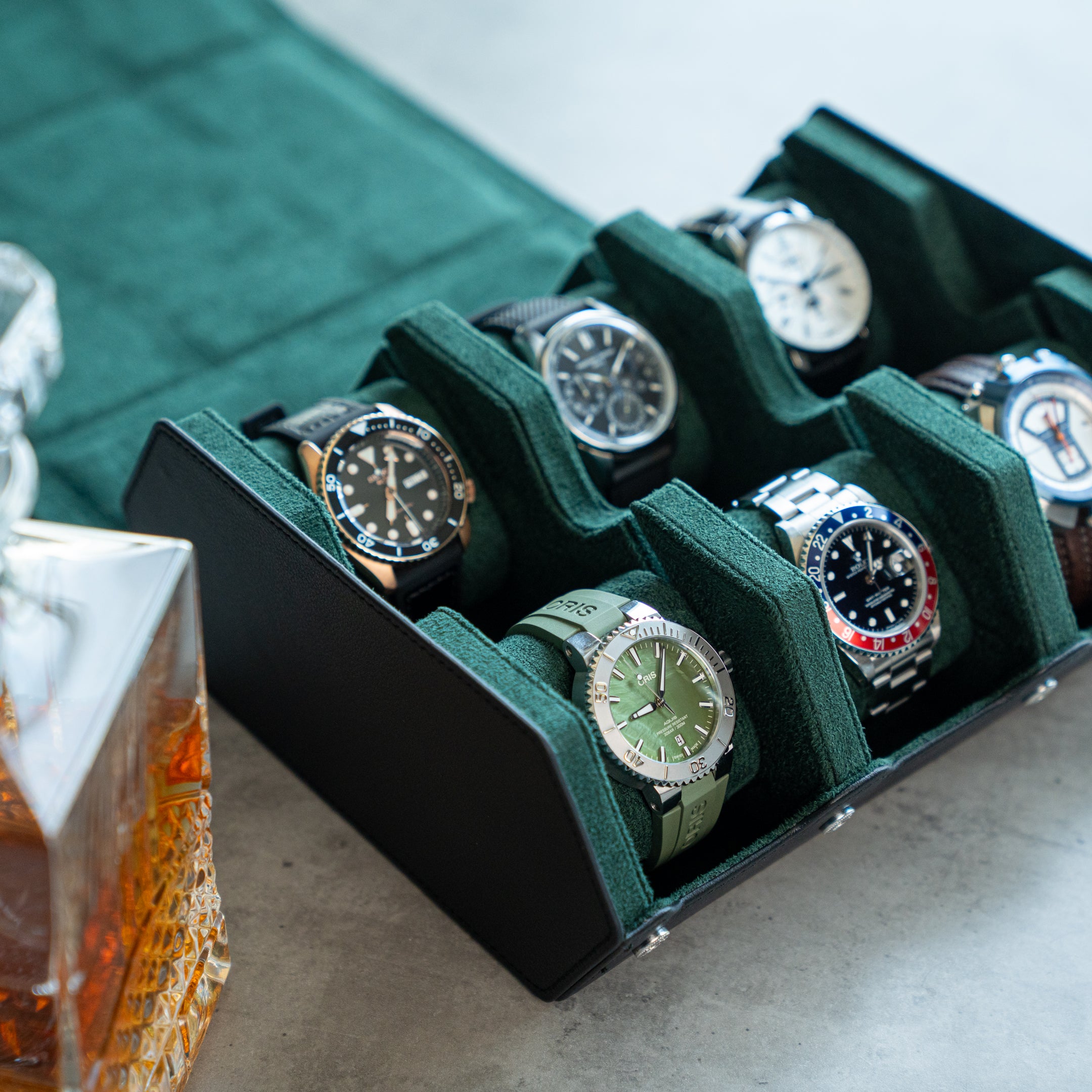 A perfect mix between a watch roll and a watch box. Introducing our watch box for 6 watches with removable cushions for each individual watch using a sliding system. It's specifically designed for watch enthusiasts and watch collectors to protect their prized possessions - whether it is for traveling or to store it at home. The Watch Box is hand made of fine black genuine leather and holds up to six watches.