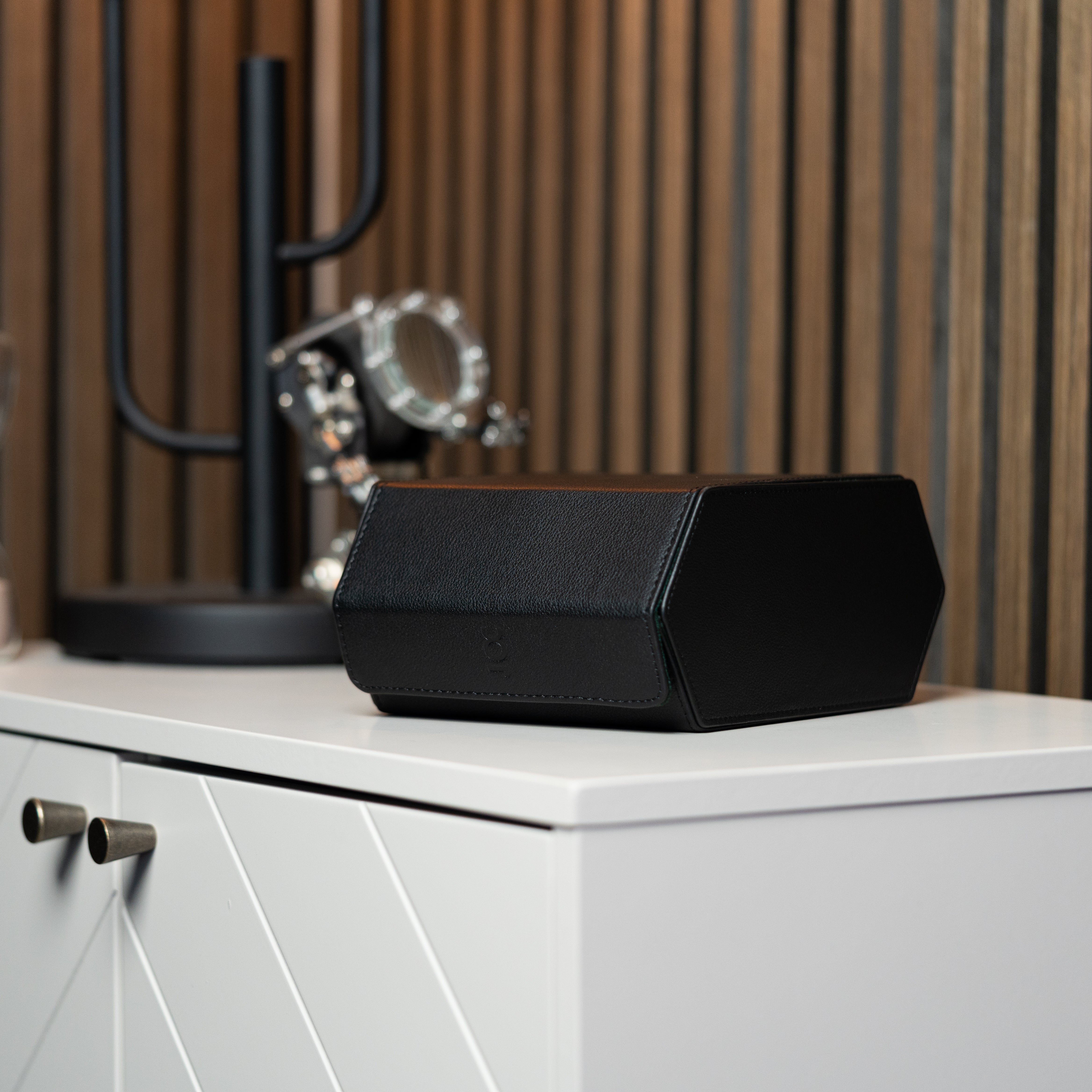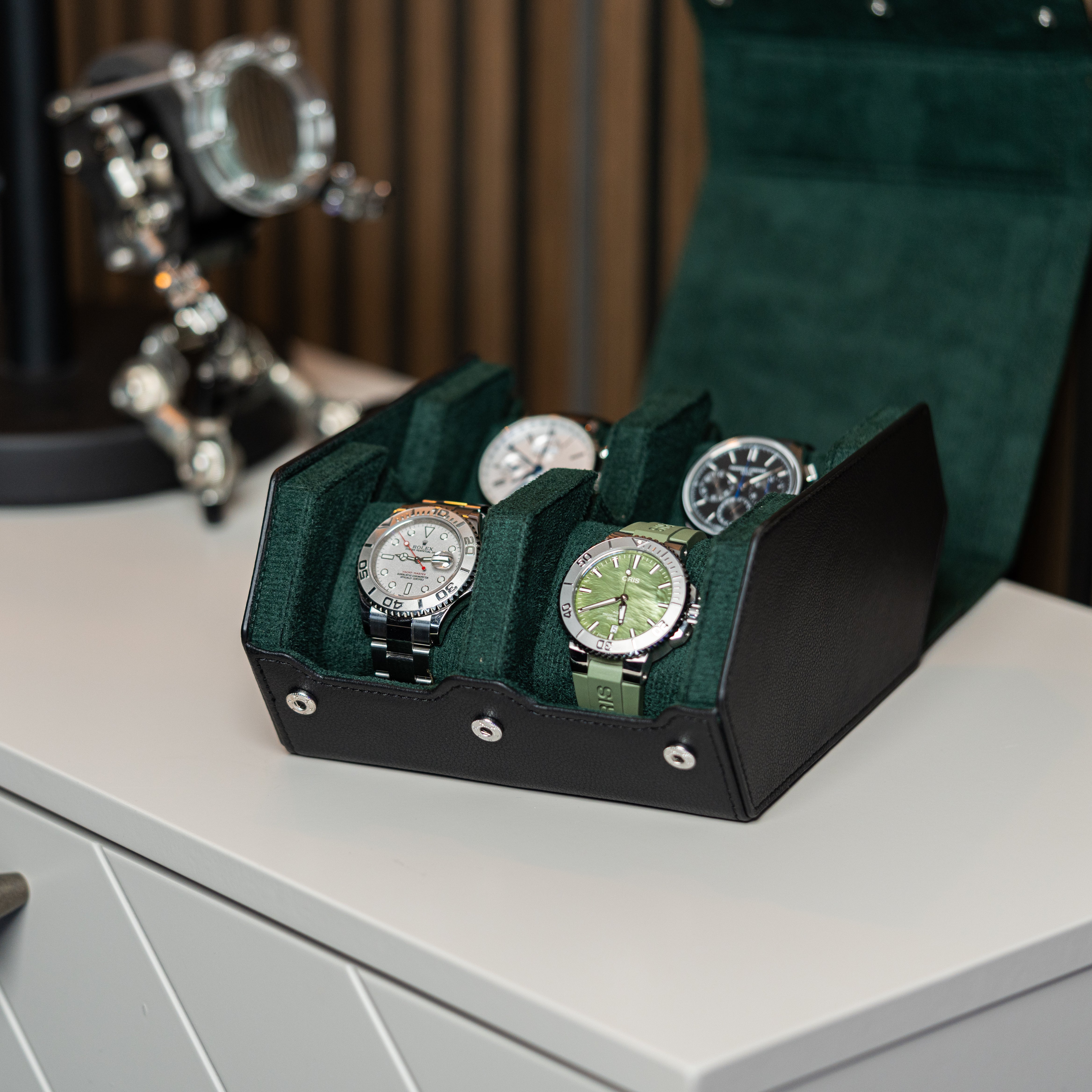 A perfect mix between a watch roll and a watch box. Introducing our watch box for 4 watches with removable cushions for each individual watch using a sliding system. It's specifically designed for watch enthusiasts and watch collectors to protect their prized possessions - whether it is for traveling or to store it at home. The Watch Box is hand made of fine black genuine leather and holds up to four watches.
