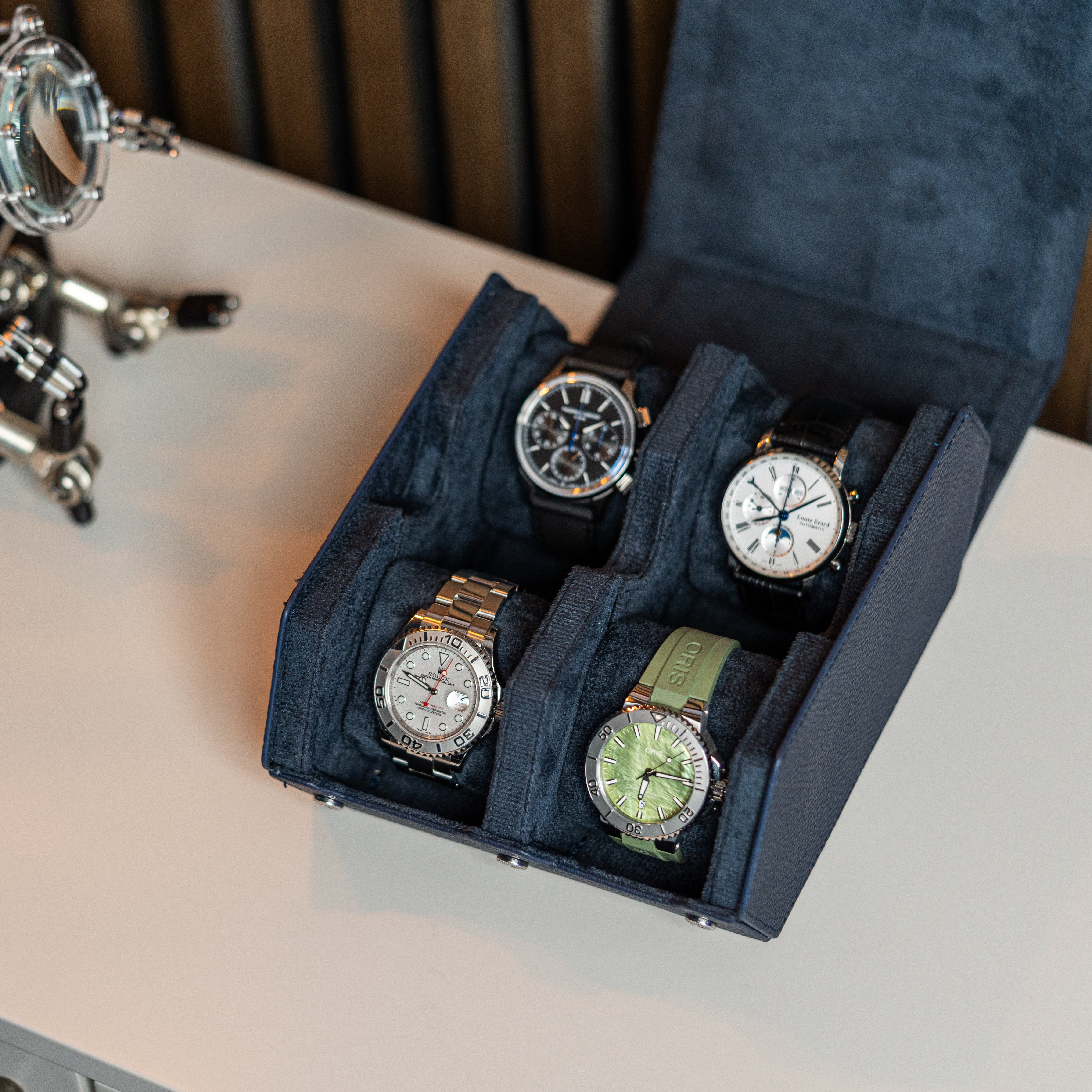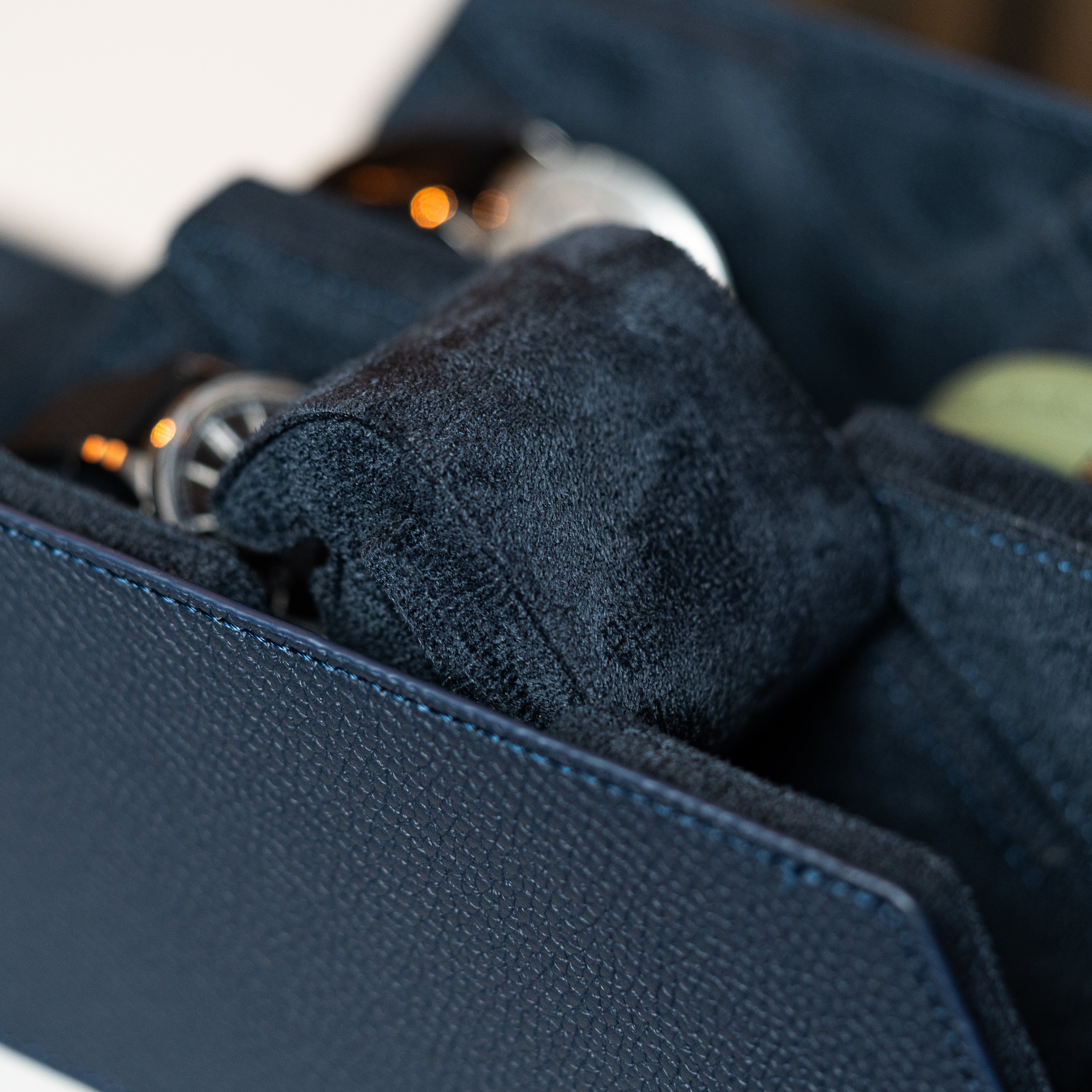 A perfect mix between a watch roll and a watch box. Introducing our watch box for 4 watches with removable cushions for each individual watch using a sliding system. It's specifically designed for watch enthusiasts and watch collectors to protect their prized possessions - whether it is for traveling or to store it at home. The Watch Box is hand made of fine navy blue litchi leather and holds up to four watches.
