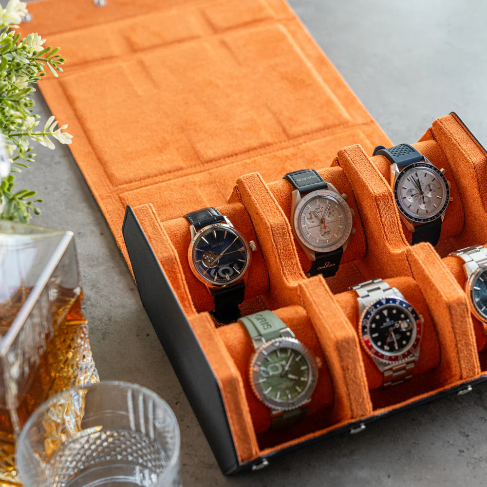 A perfect mix between a watch roll and a watch box. Introducing our watch box for 6 watches with removable cushions for each individual watch using a sliding system. It's specifically designed for watch enthusiasts and watch collectors to protect their prized possessions - whether it is for traveling or to store it at home. The Watch Box is hand made of fine black genuine leather and holds up to six watches.