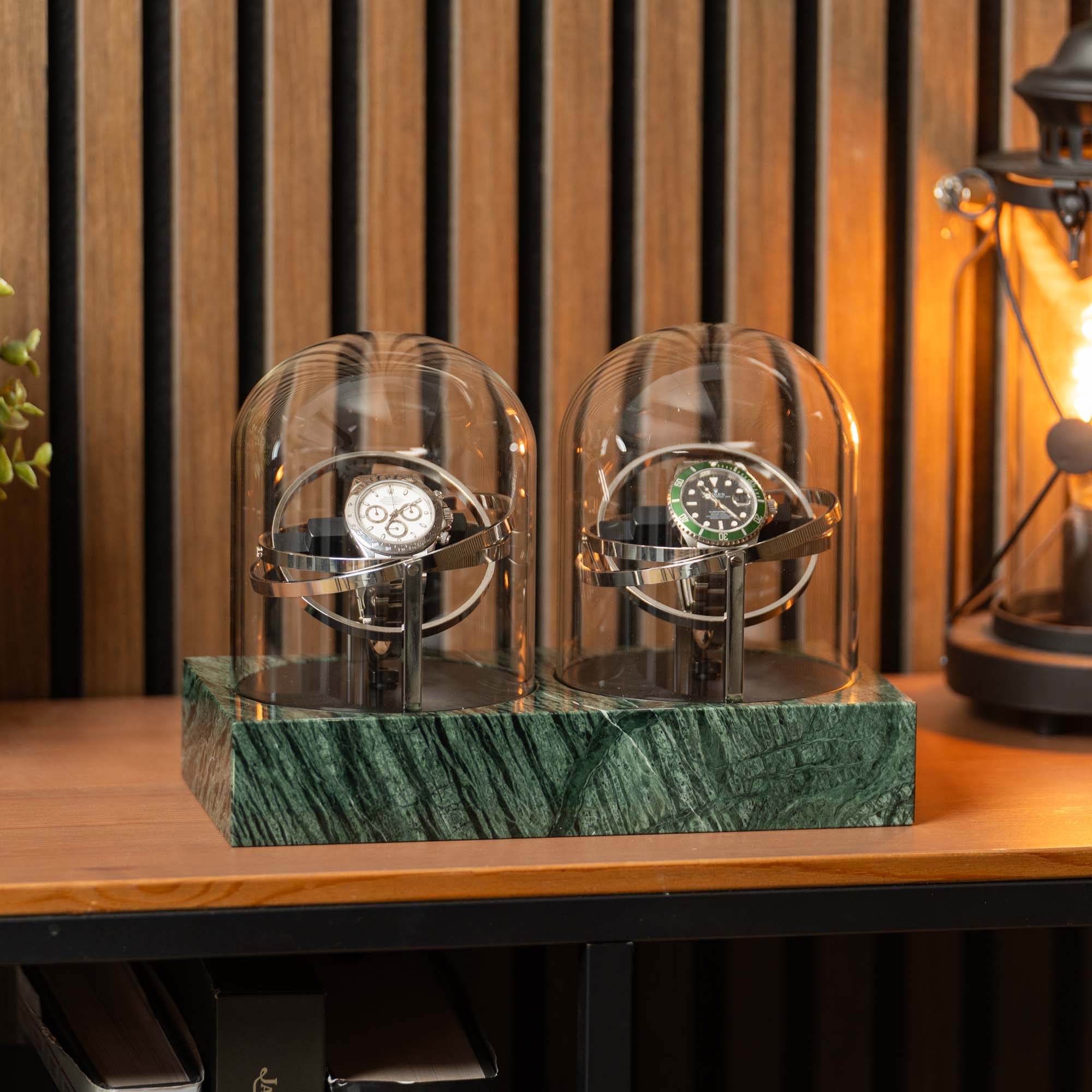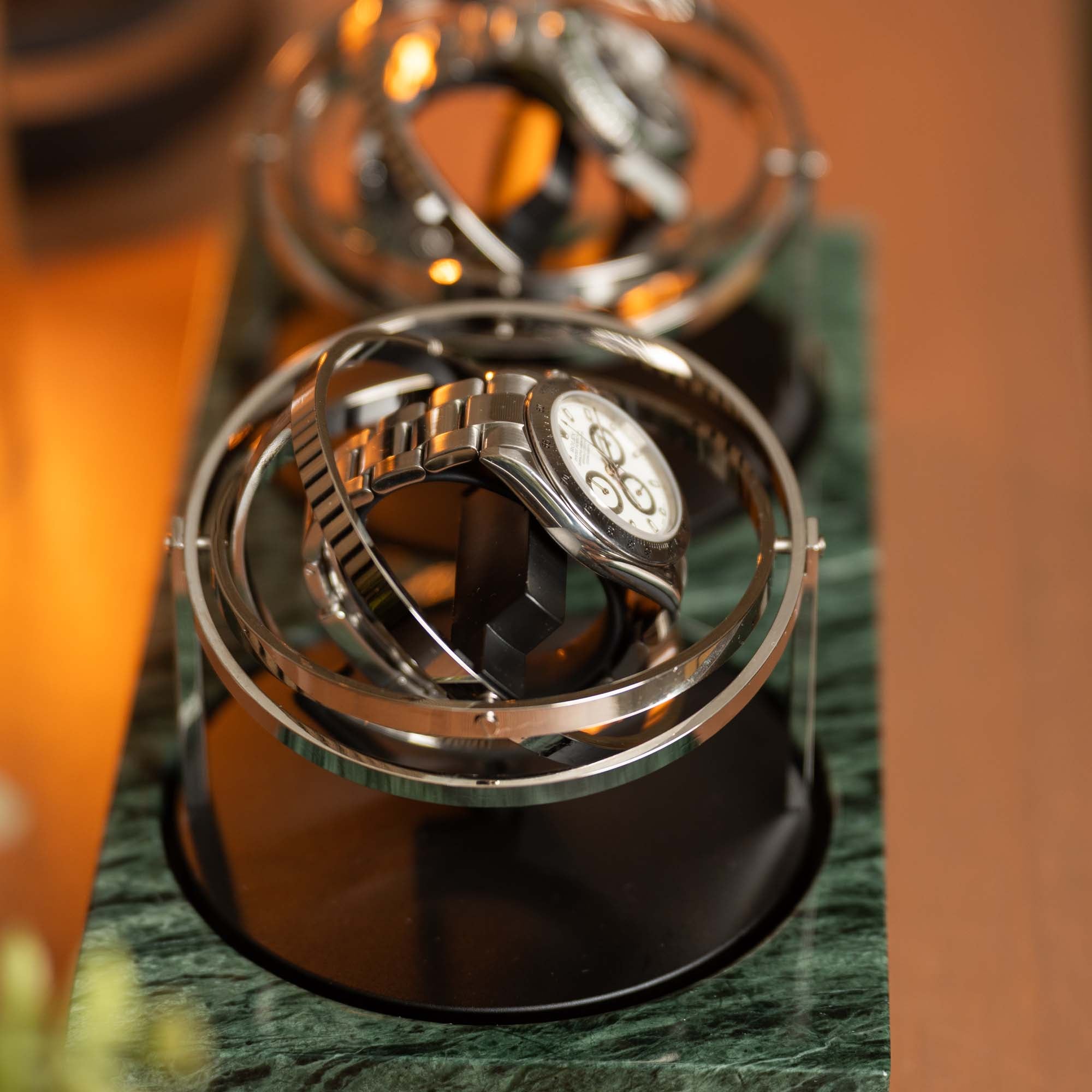 This striking duo watch winder combines gyroscopic inspired motion with a solid marble base, making sure your mechanical watch is ready and functional at all times.