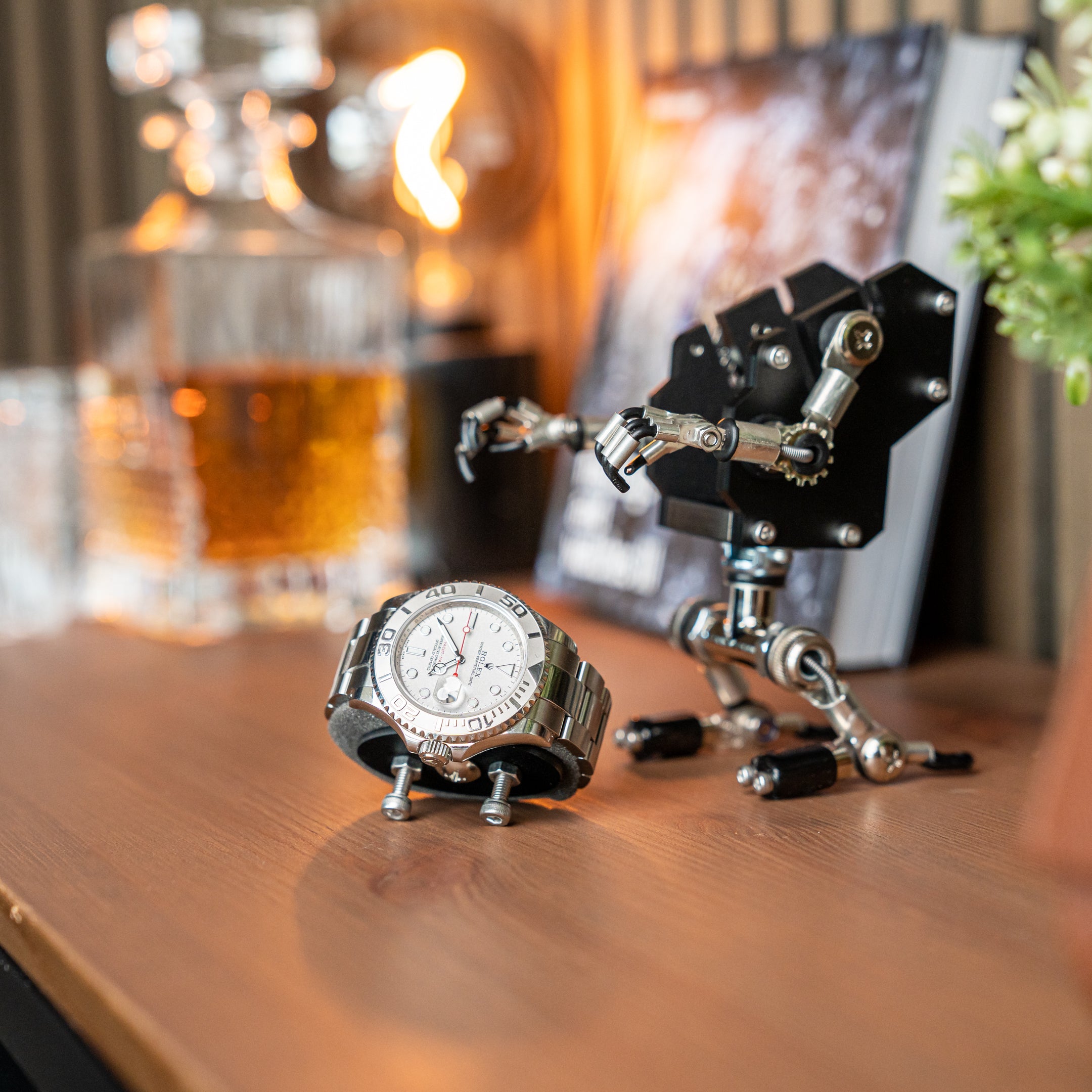 Meet our Robotoy. The Robotoy is the ultimate watch stand for your precious watch. The arms and hands of the robot can be changed to a position of your choosing and it will give a different character to the Robotoy.