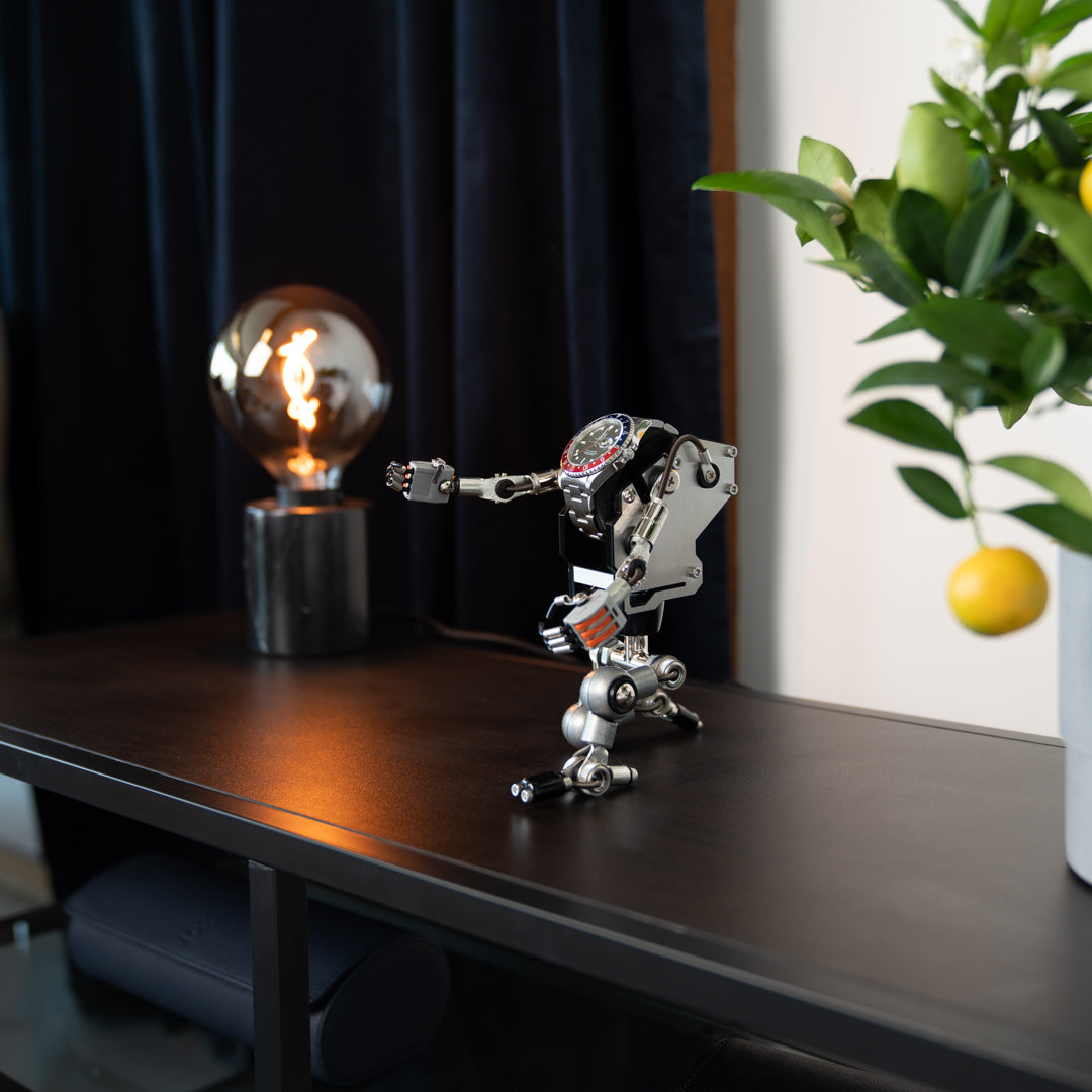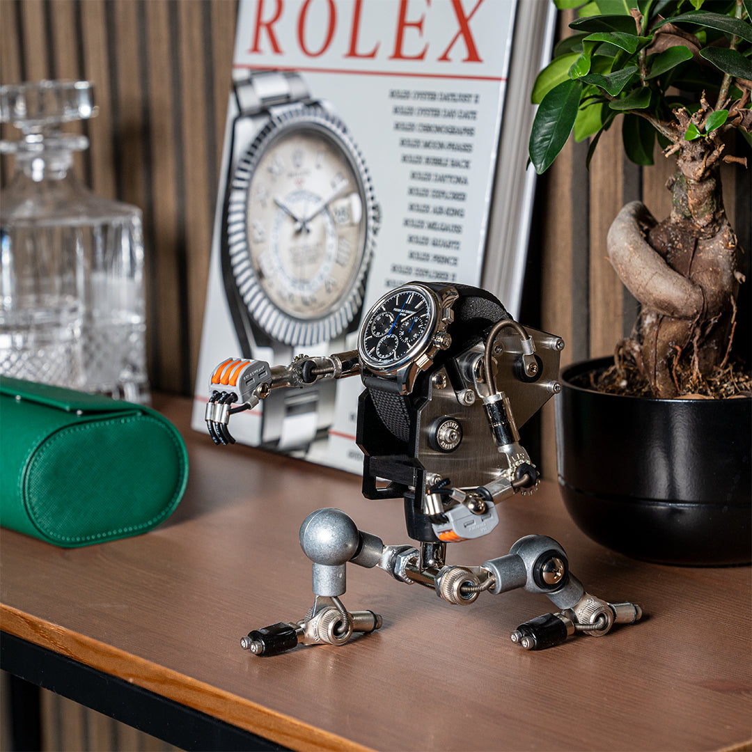 Meet our Robotoy. The Robotoy is the ultimate watch stand for your precious watch. The arms, hands and legs of the robot can be changed to a position of your choosing and it will give a different character to the Robotoy.