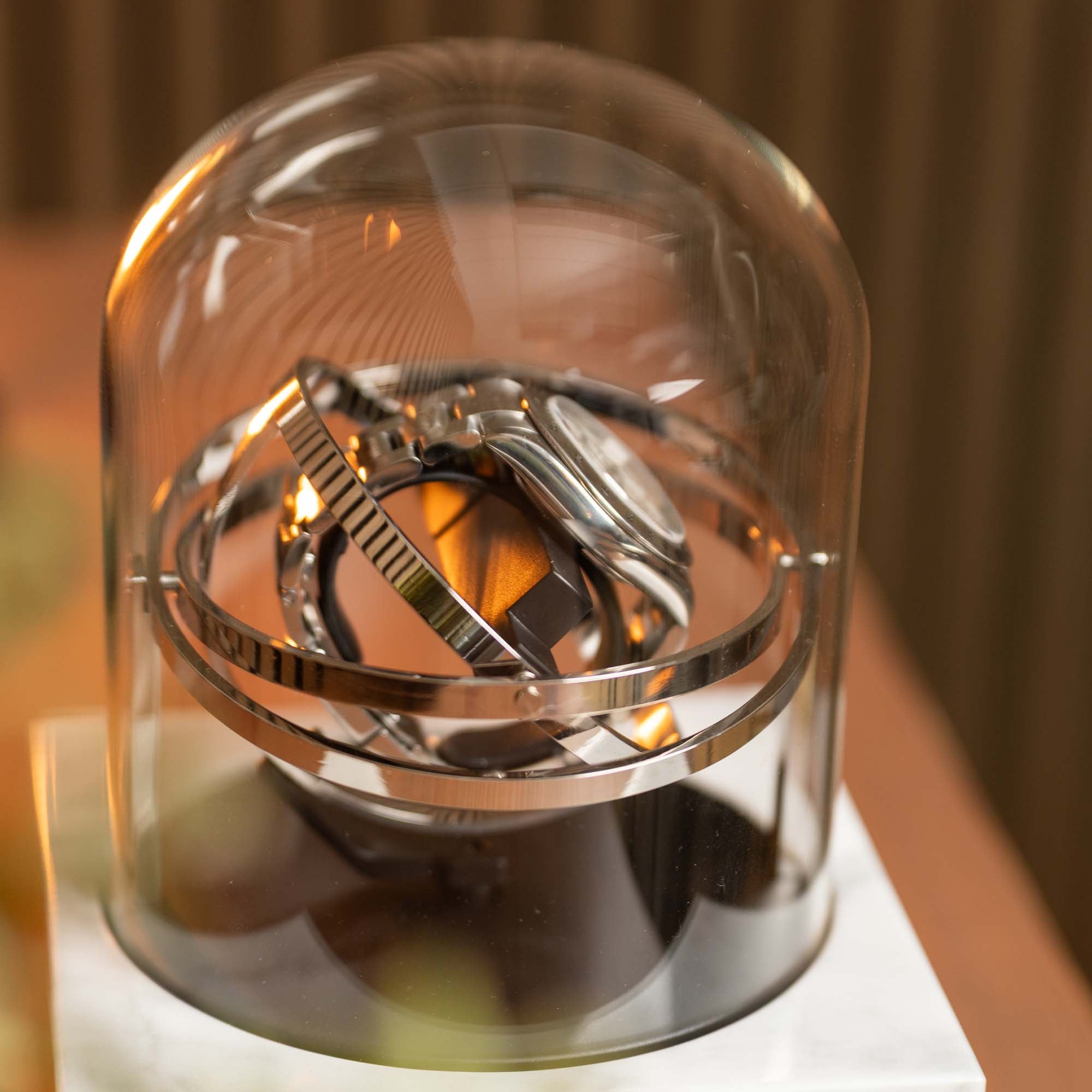 Designed for watch collectors, the winder gently simulates natural wrist movement using a gyroscopic inspired motion - ensuring your automatic watch stays perfectly wound and ready to wear. The rotating cradle floats effortlessly within concentric rings, offering a mesmerizing kinetic display while being a modern art piece. Perfect as a gift or centerpiece for any watch lover’s collection.
