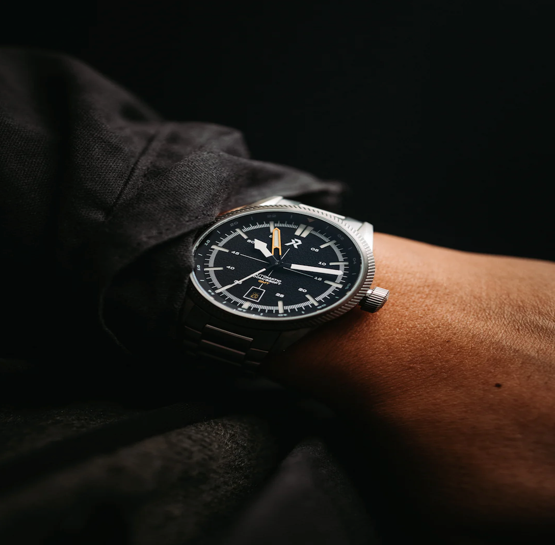 One glance at the Fortitude GMT and you'll know why it's the pilot's watch. Featuring a jet turbine inspired bezel, signature hands & indexes, a sandwich dial with generous lume, and an extra-large crown, whether you're in the cockpit, jump seat or backseat, you'll always know when it's time for take-off. Prioritizing legibility, the custom handset for ‘local time’ and a prominent ‘home time’ hand ensures you'll never lose a minute crossing borders or timezones.