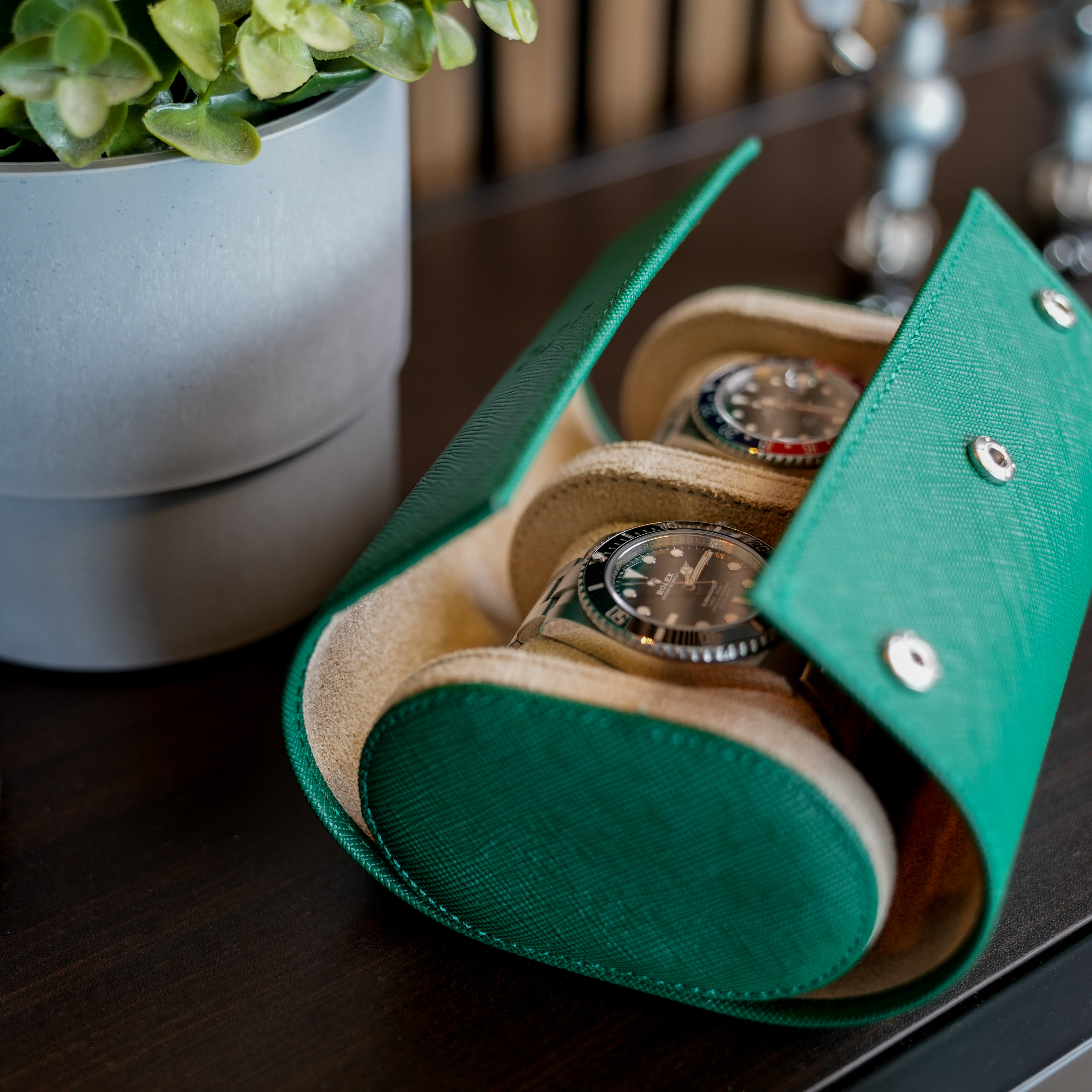 The Two Slot Watch Roll is the perfect home for your favourite watches. It is ideal to carry your watches with you on any occasion, or for daily storage. It is handmade with fine genuine green saffiano leather, which is a long-lasting leather material commonly used by luxury brands.
